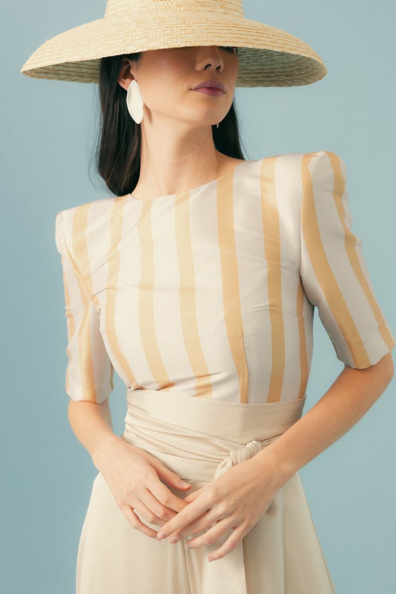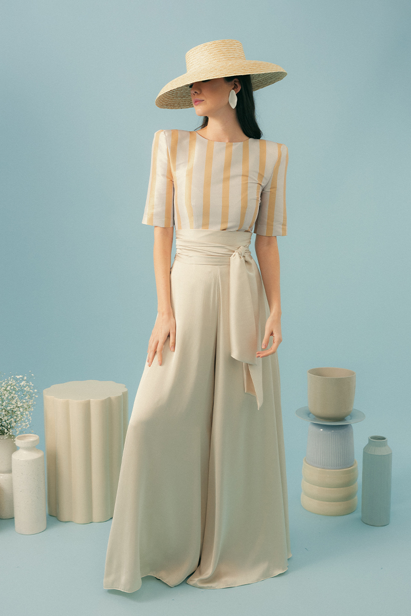 Una prenda moderna con alma vintage. Esta blusa de rayas en color crema y ocre es la definición de la elegancia sin esfuerzo. Su estructura en los hombros crea una silueta impactante, mientras que su tejido fluido asegura comodidad durante todo el día.