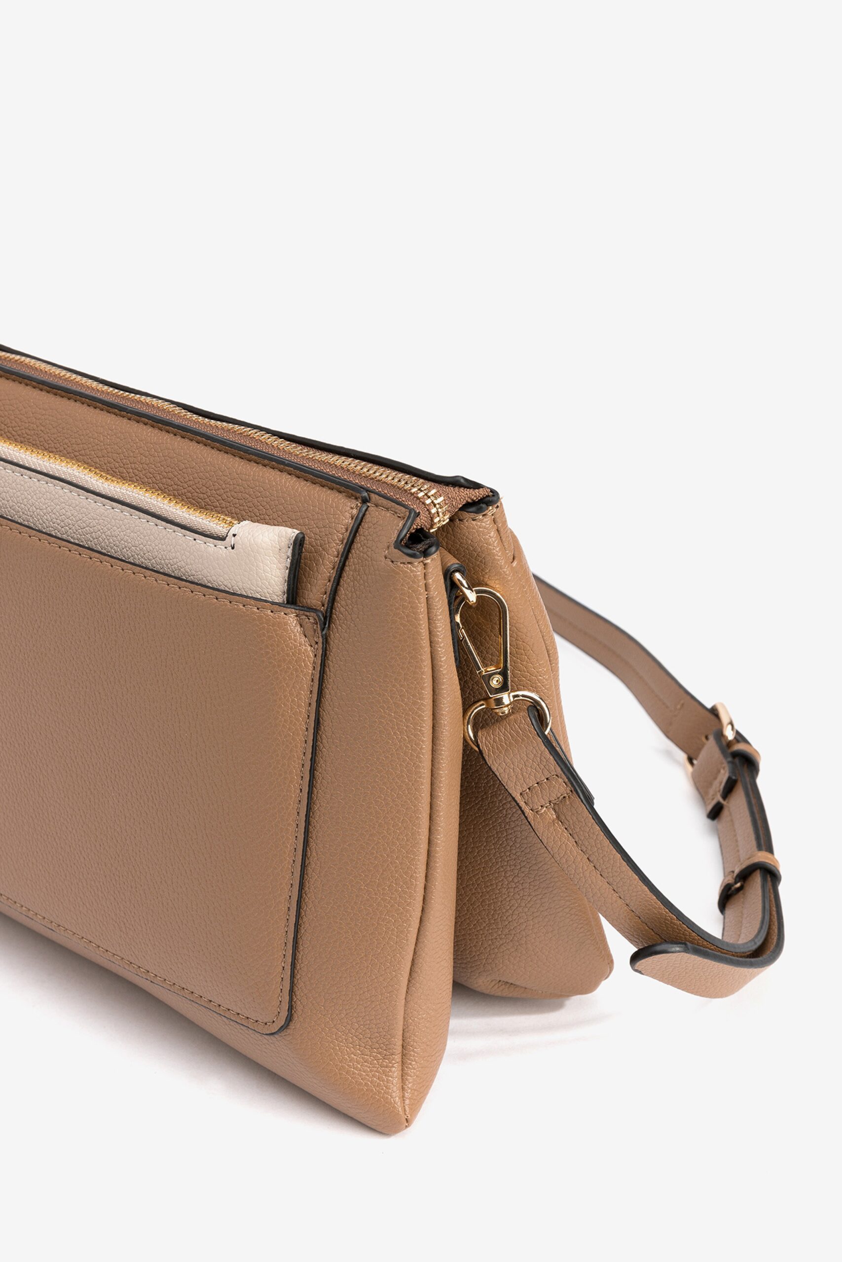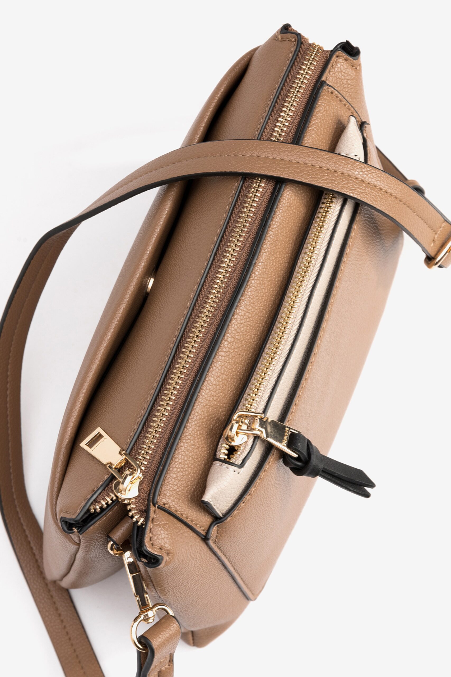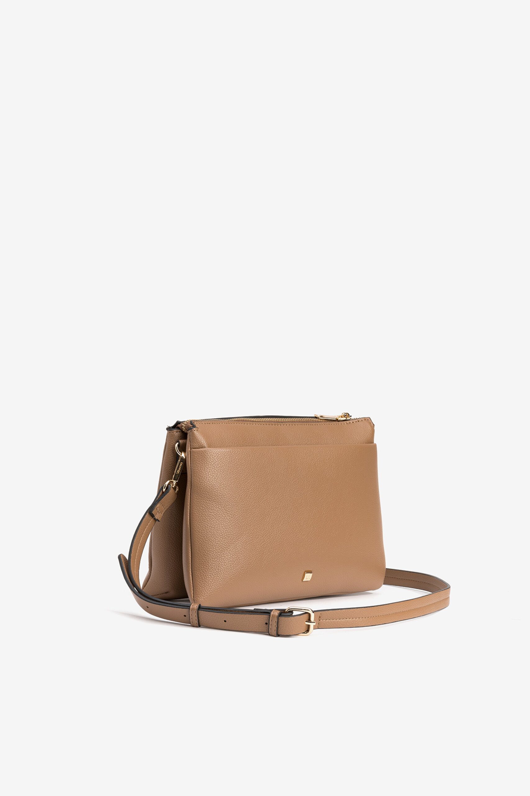 Bolso bandolera camel con cierre de cremallera y correa ajustable.