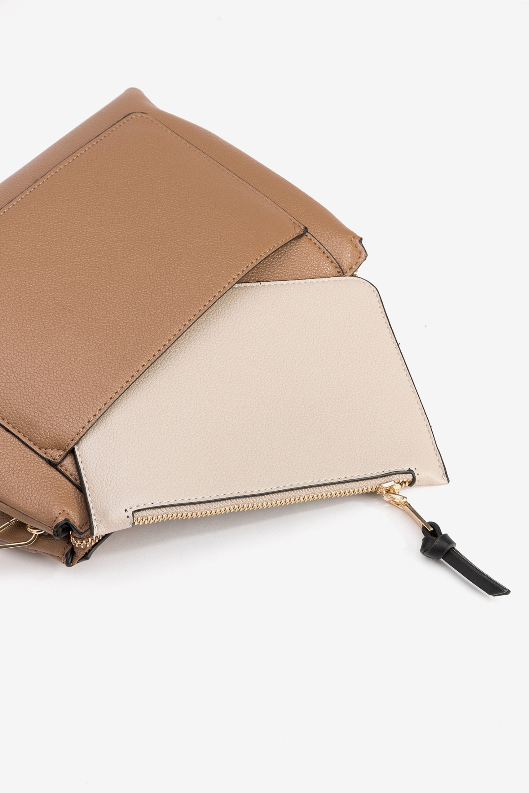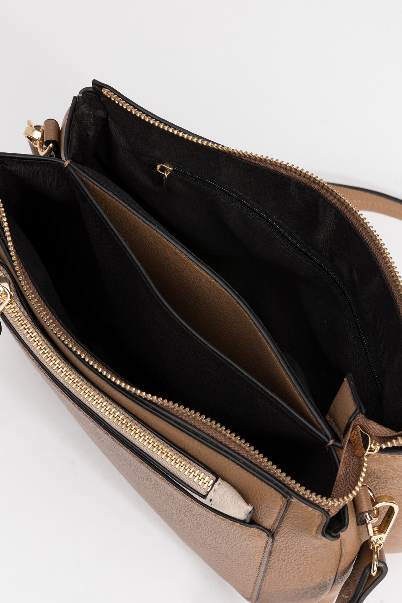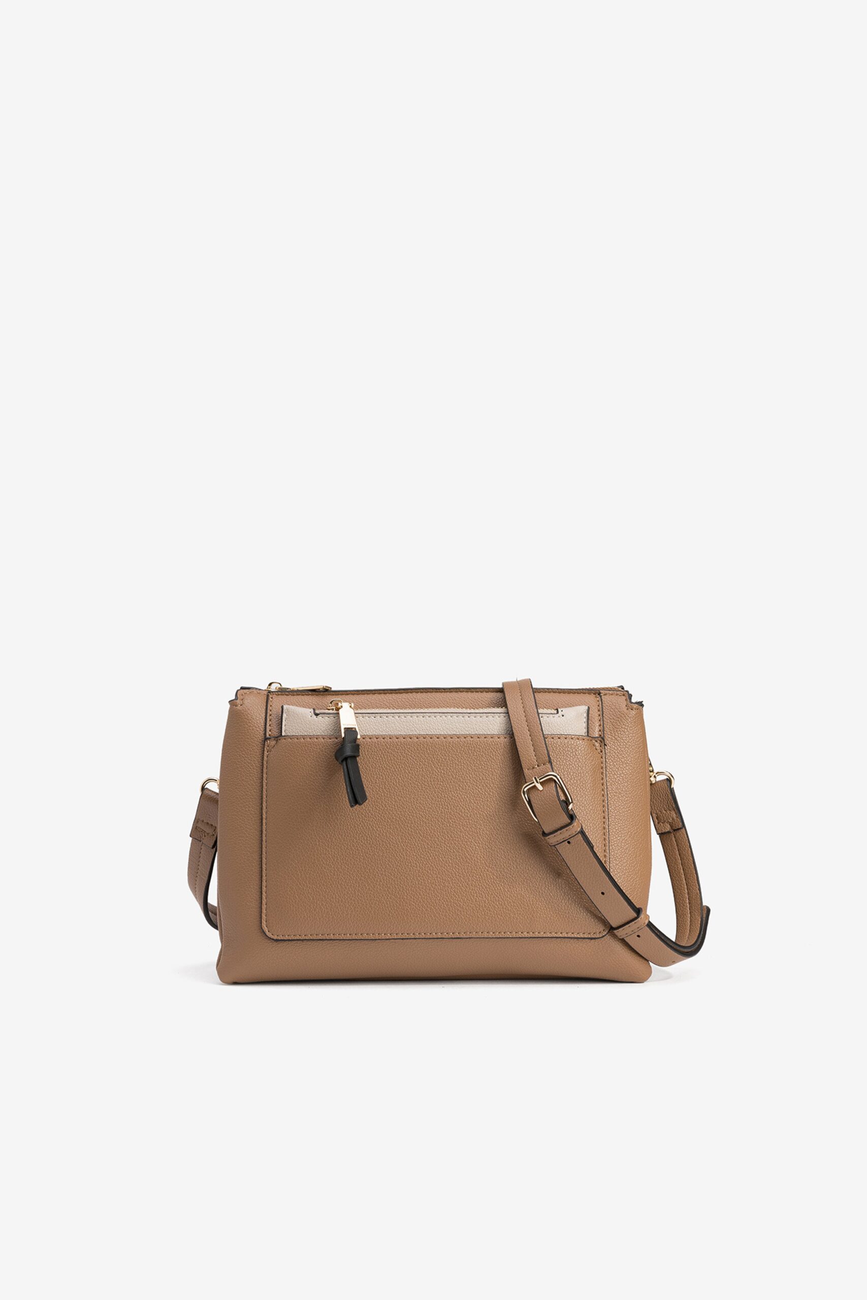 Bolso bandolera camel con cierre de cremallera y correa ajustable.