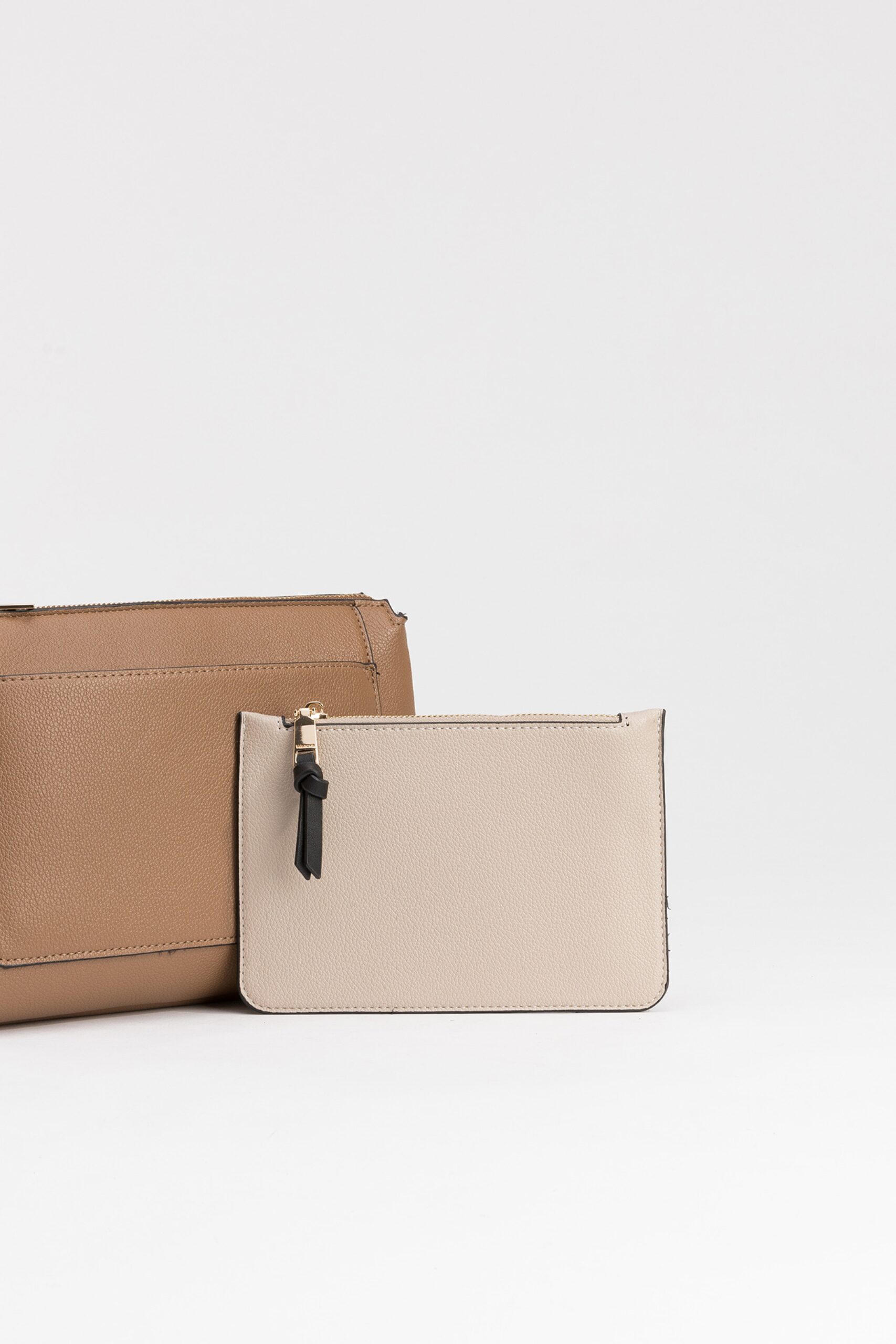Bolso bandolera marrón con cierre de cremallera, bolsillo frontal y correa ajustable. Incluye monedero beige.
