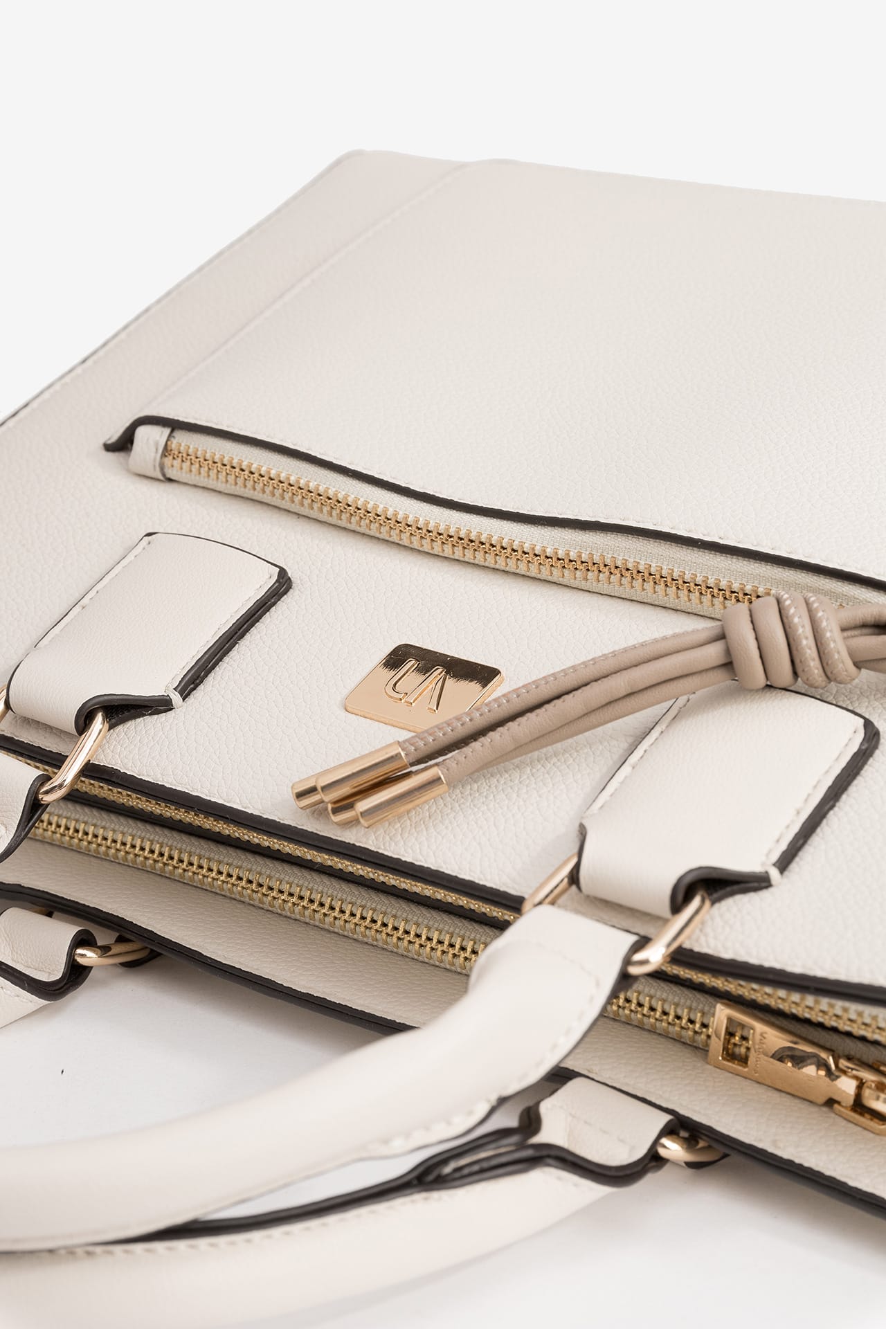 Bolso city efecto piel con dos bolsillos, detalle de nudo con extremos metálicos y cierre de cremallera superior.