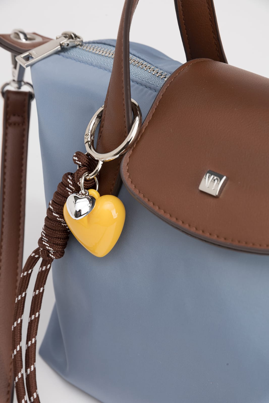 Bolso city de nailon combinado con efecto piel y colgante de corazón amarillo con cuerda. Asas de mano fijas y correa de hombro ajustable y extraíble. Solapa con botón de presión y cierre superior de cremallera. Bolsillo interior con cremallera. Tamaño pequeño.