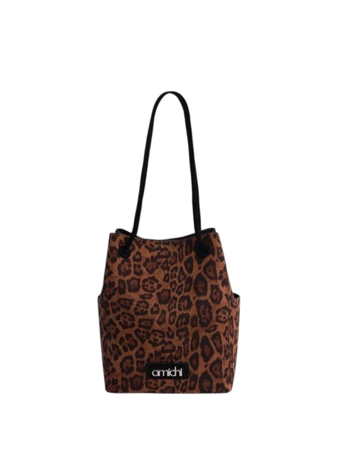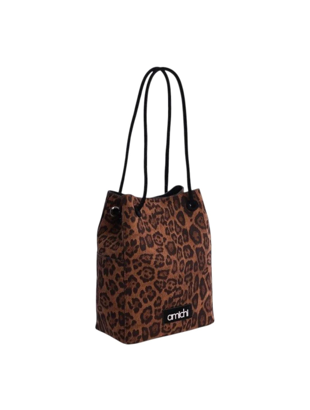 Bolso tipo saco de la marca Amichi en animal print de ante suave con asas para llevar al hombro, muy ligero con bolsillos interiores y cierre de botón.