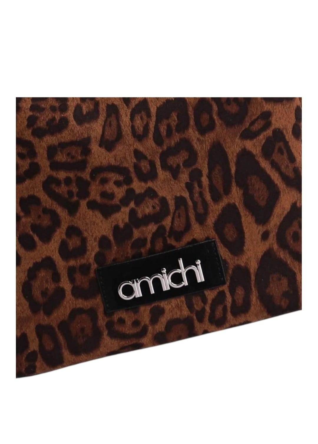 Bolso Amichi tipo saco en animal print de ante con asa de hombro para colgar.