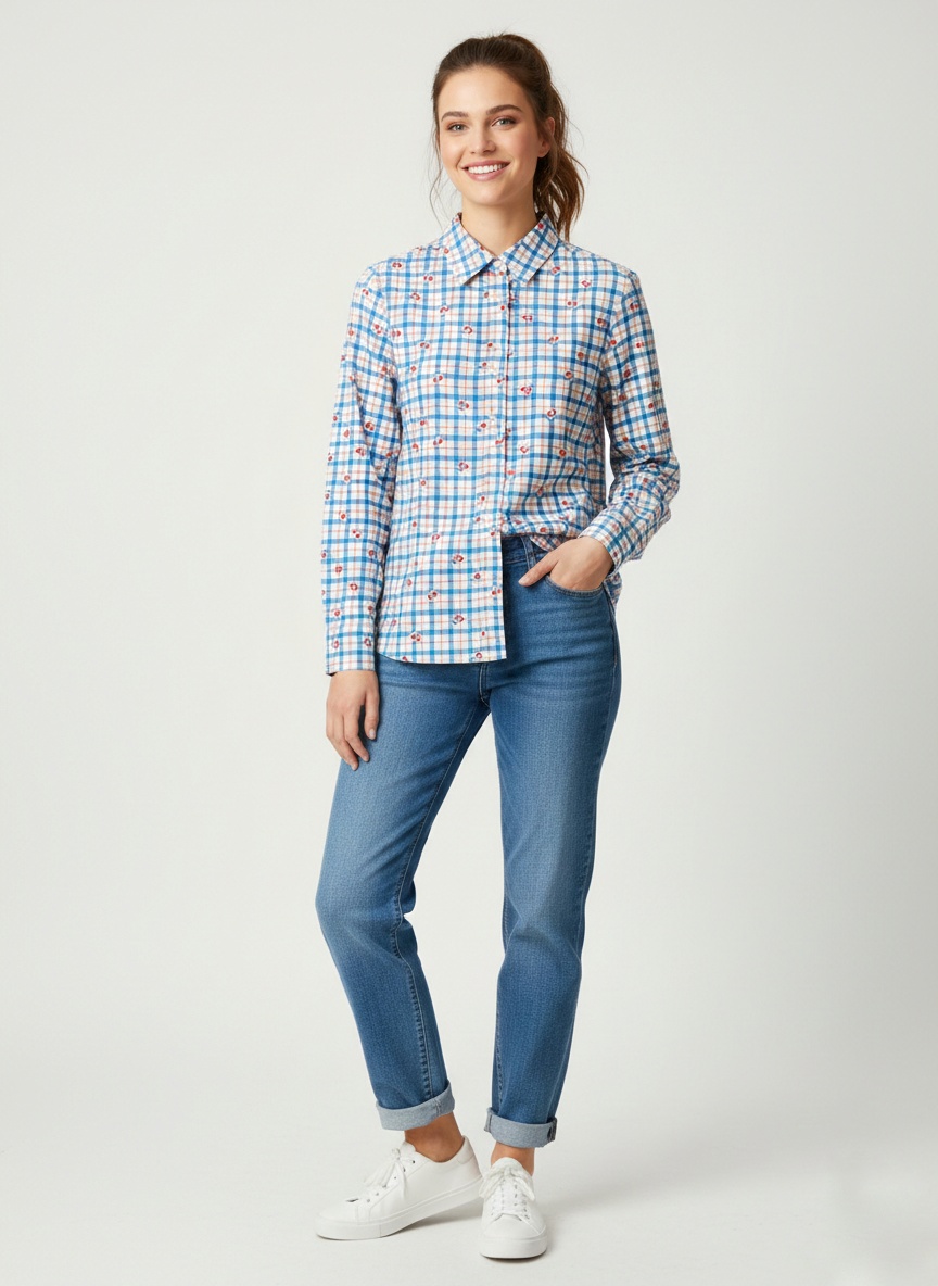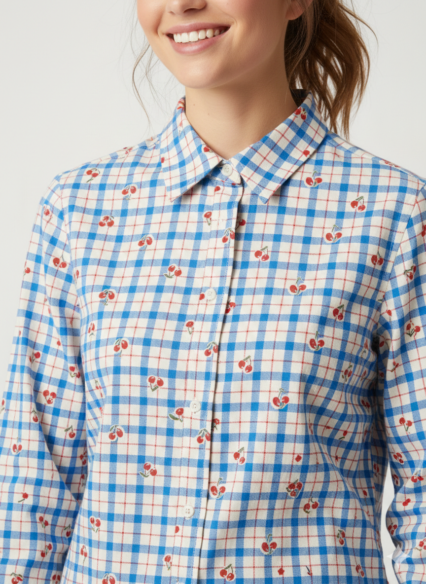 Dale un giro fresco a tu armario con nuestra camisa de botones, que combina el tradicional cuadro vichy con un encantador motivo de cerezas estampadas. Es esa prenda versátil que funciona tanto para un día de oficina relajado como para una salida de fin de semana.