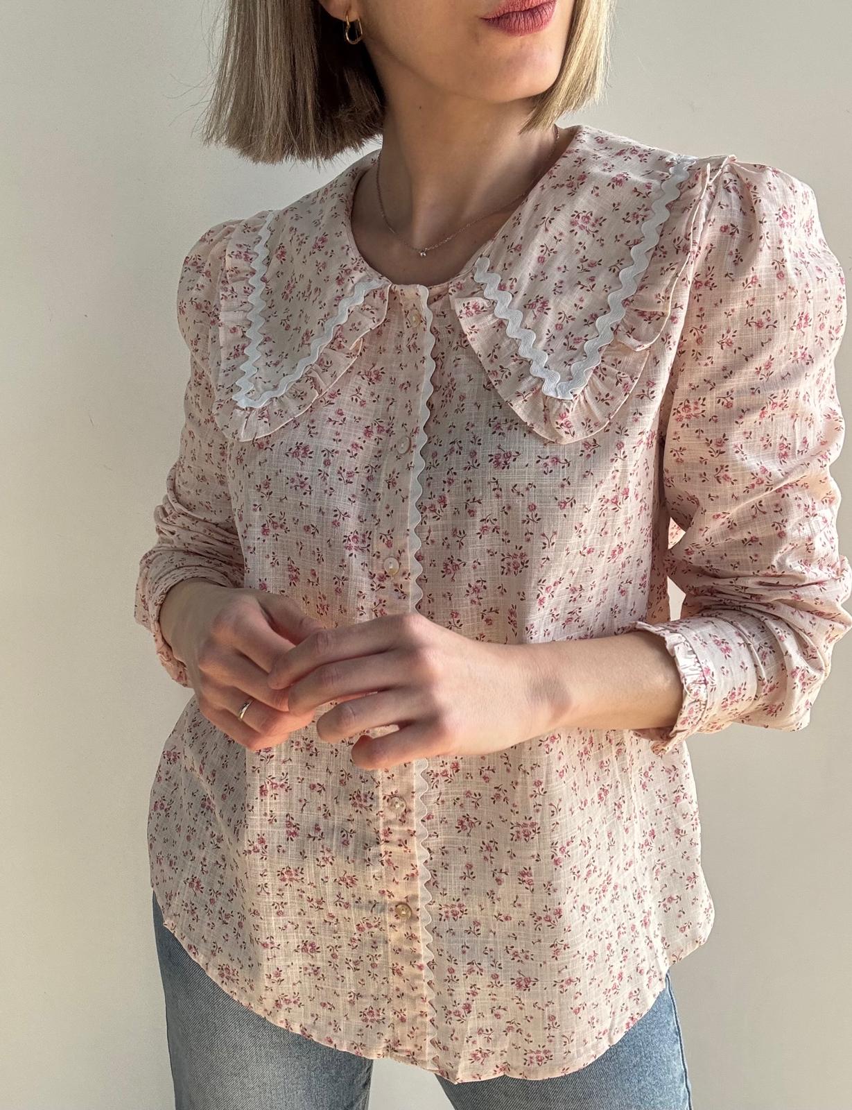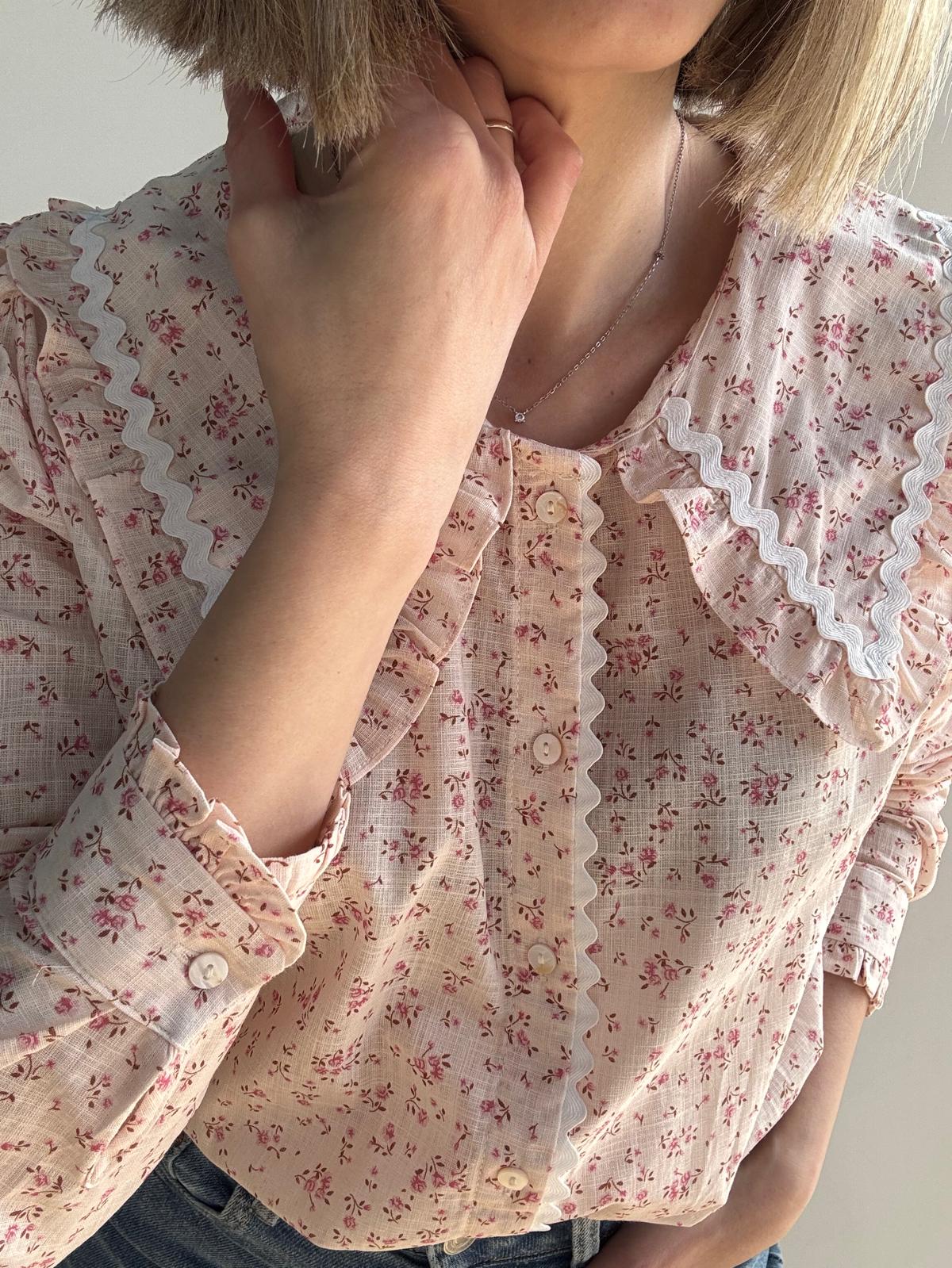 Enamórate de los detalles con esta blusa en tono rosa empolvado y micro-estampado floral. Su diseño destaca por un impresionante cuello babero con volantes y una cinta de ondas bordada en contraste blanco, que aporta luz y estructura al rostro.