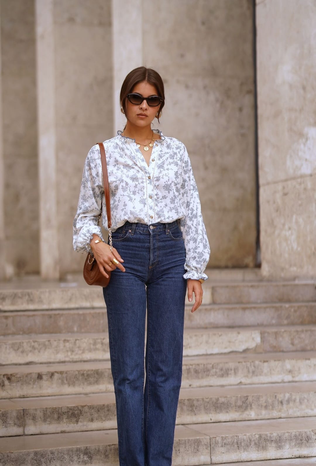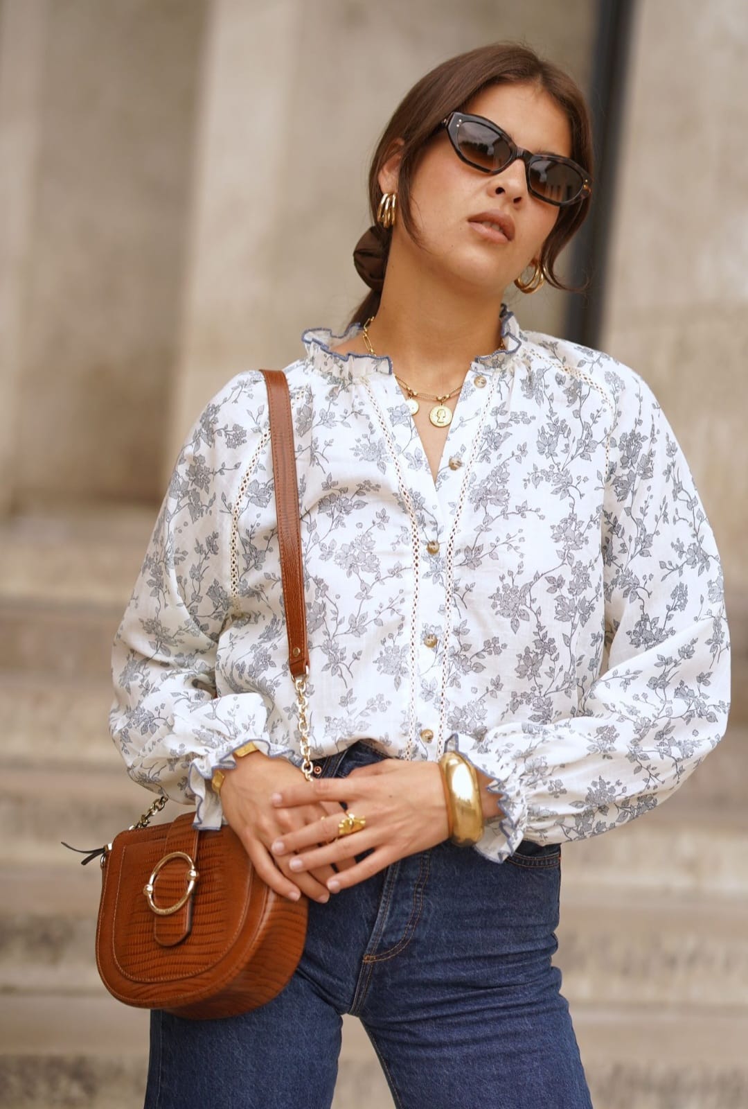 Camisa estampada de flores azul con detalle de volantes en el cuello y en las mangas, cierre con botones y manga larga. Detalle troquelado en los hombros y en los botones.