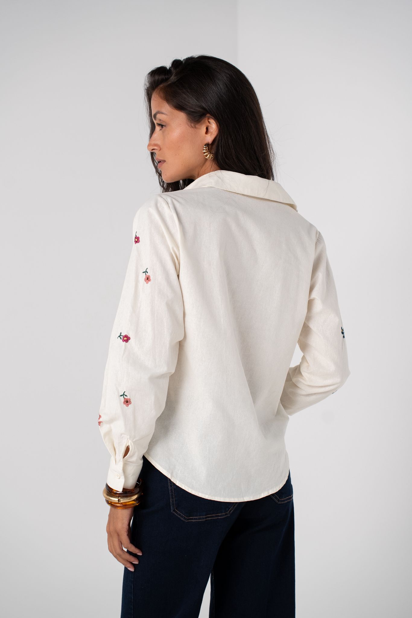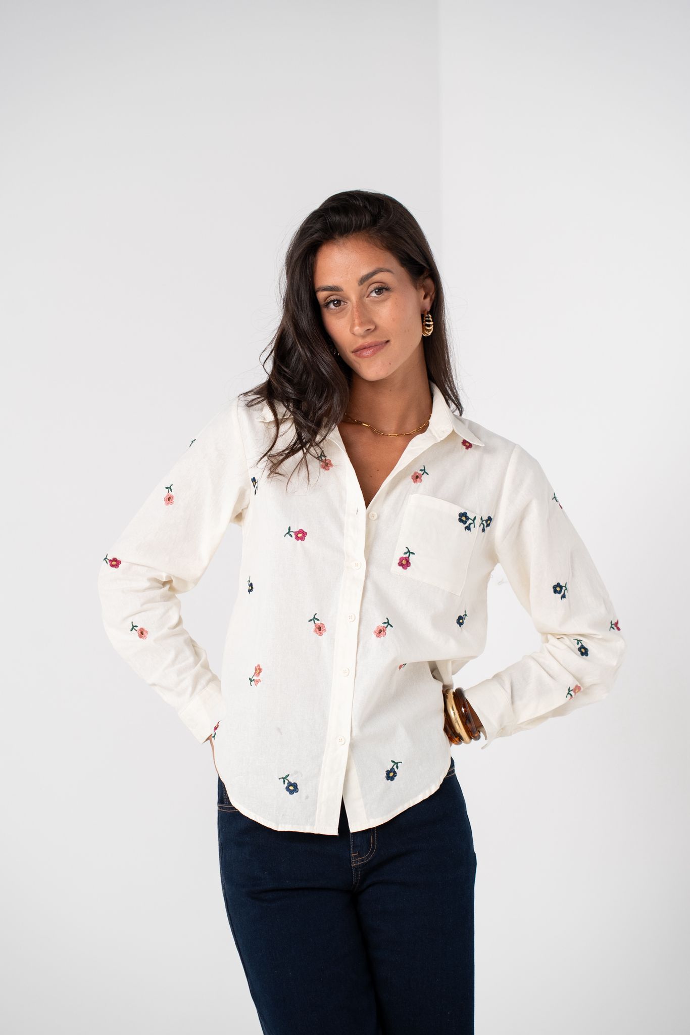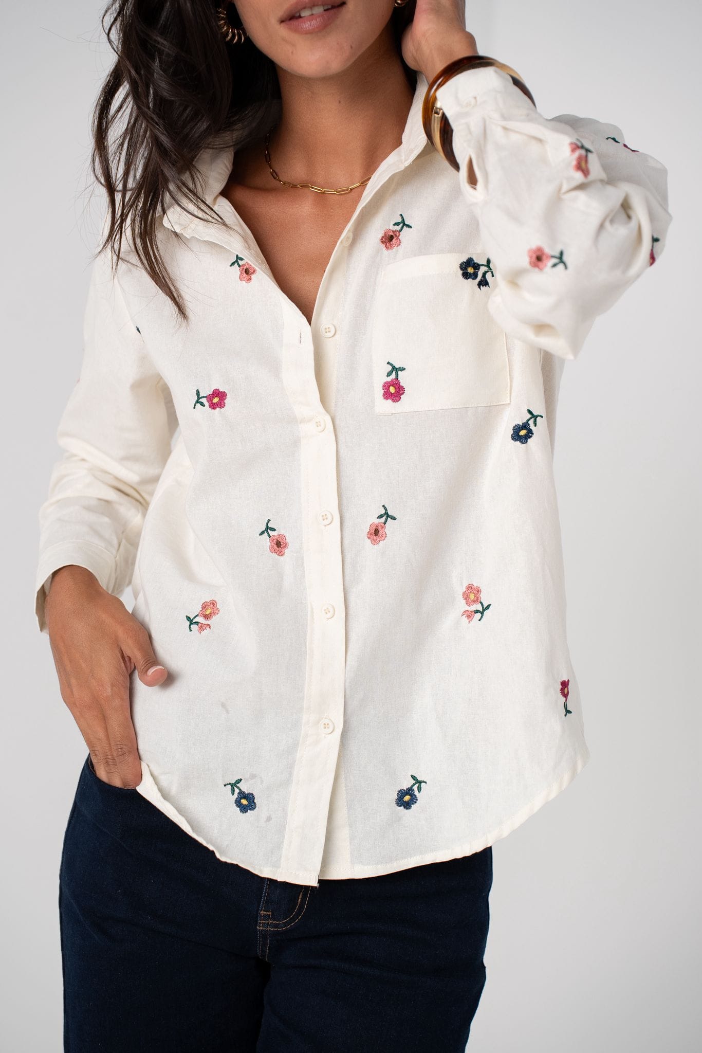 Camisa en color blanco de flores bordadas con detalle de bolsillo en el delantero.
