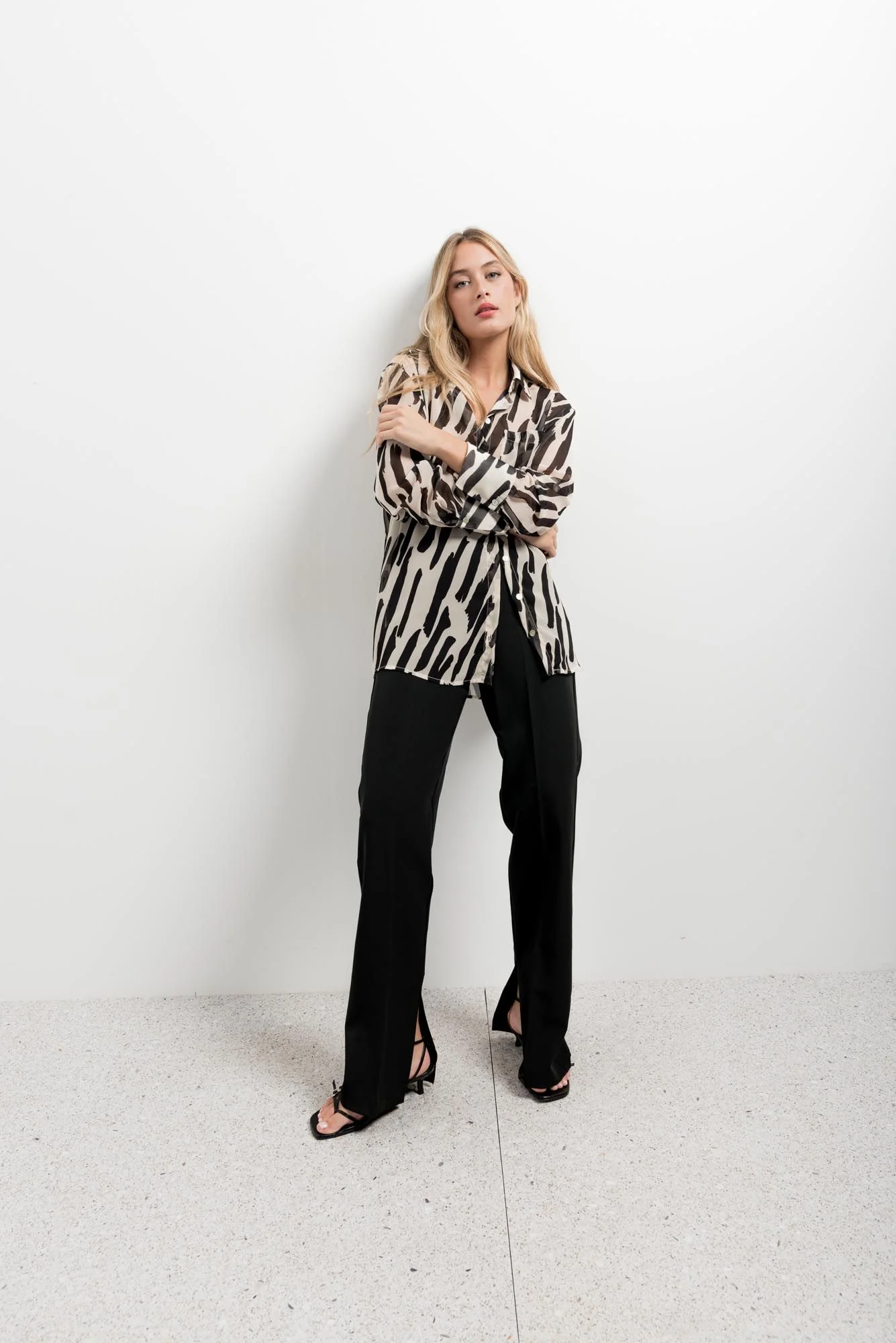 Camisa con cuello camisero confeccionada en tejido de gasa estampado en print de rayas blanco y negro de manga larga con detalle de bolsillo.