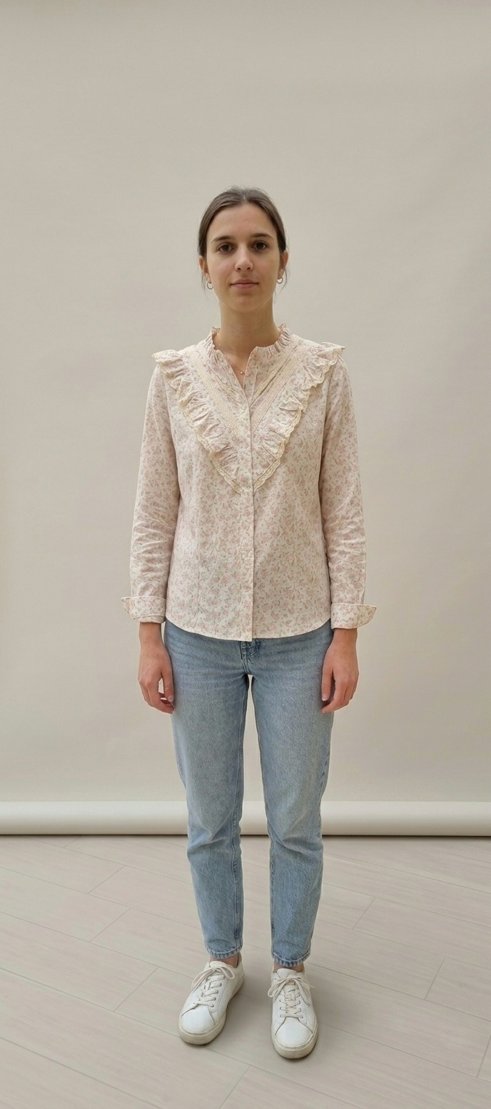 • Cuello Mao con Volante: El cuello ligeramente alzado cuenta con un pequeño volante fruncido que enmarca el rostro con elegancia.