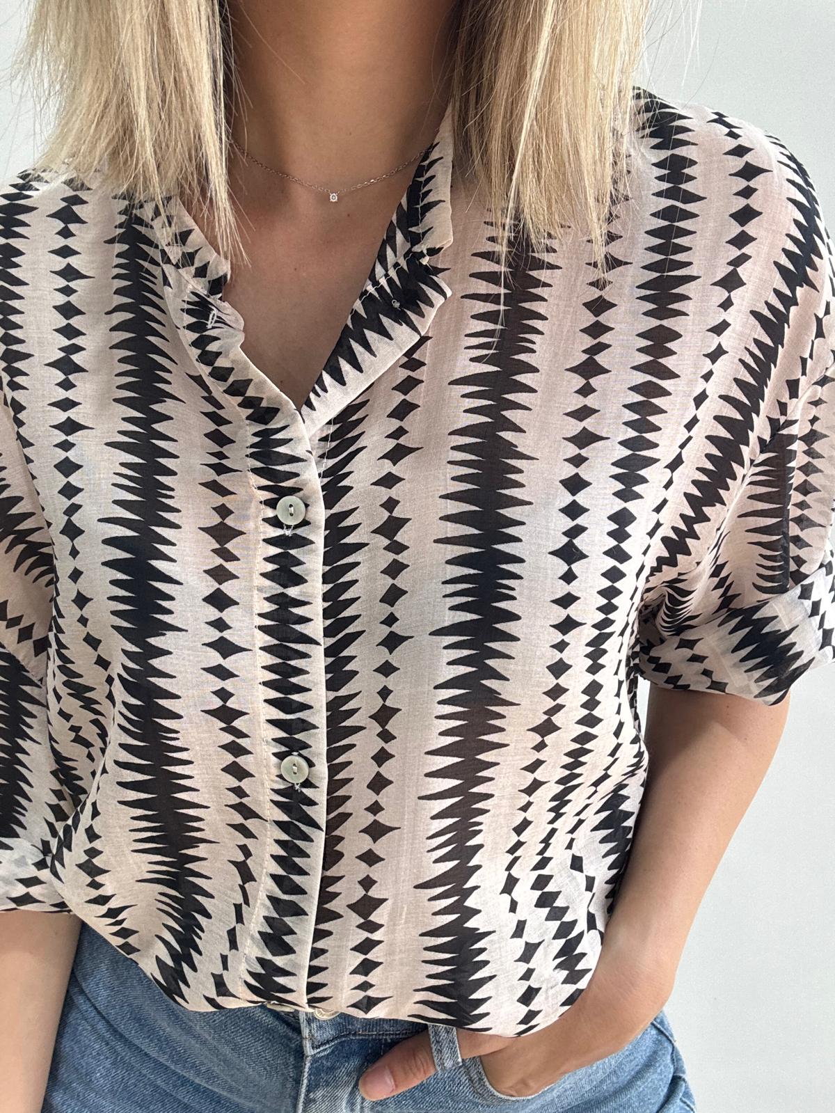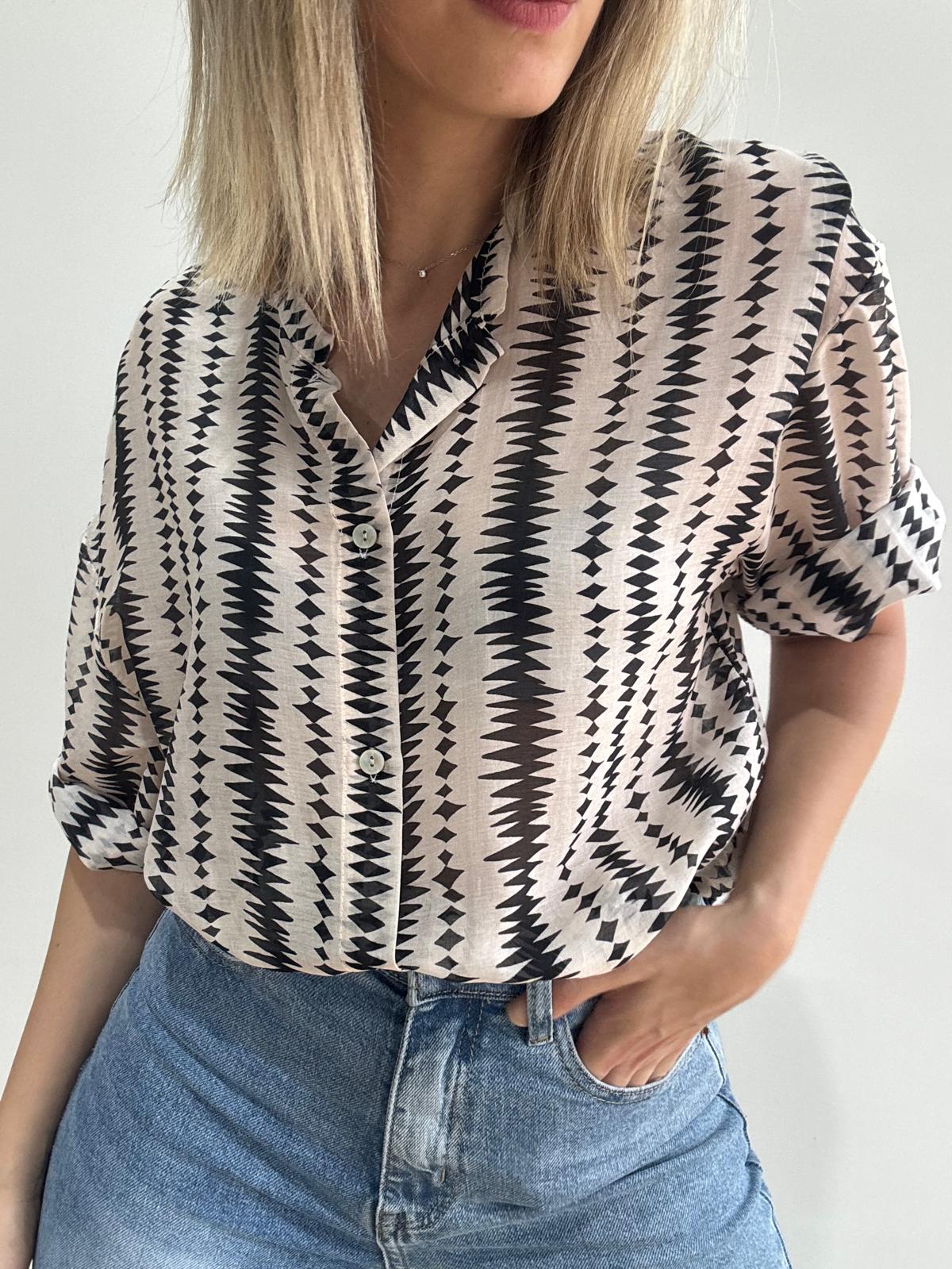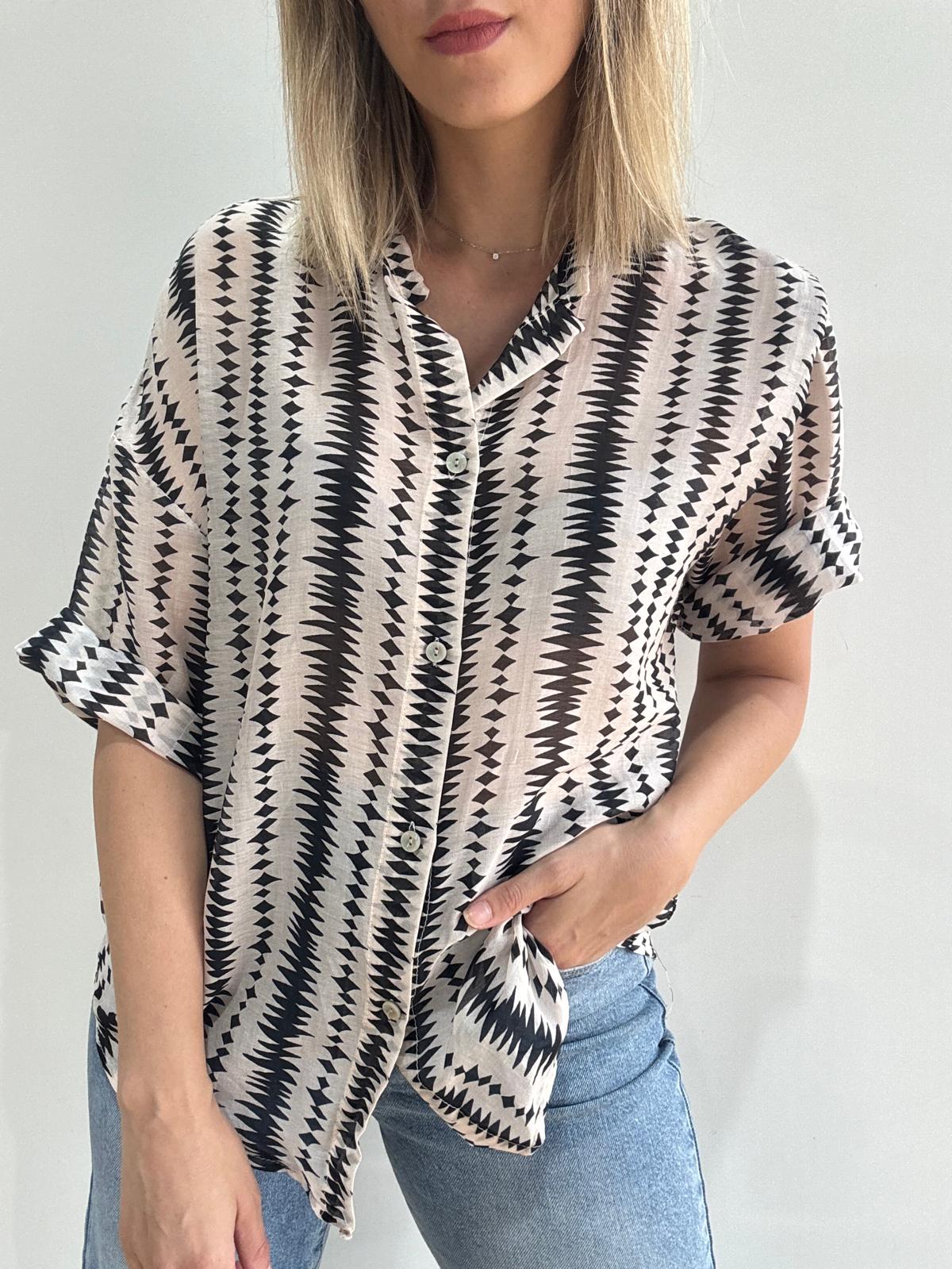 Camisa estampada de corte oversize con cierre de botones y manga tres cuartos.