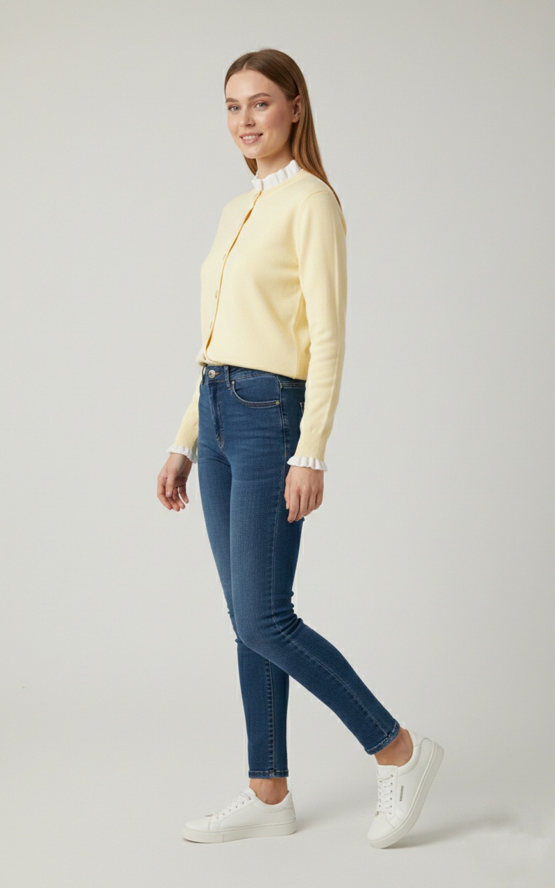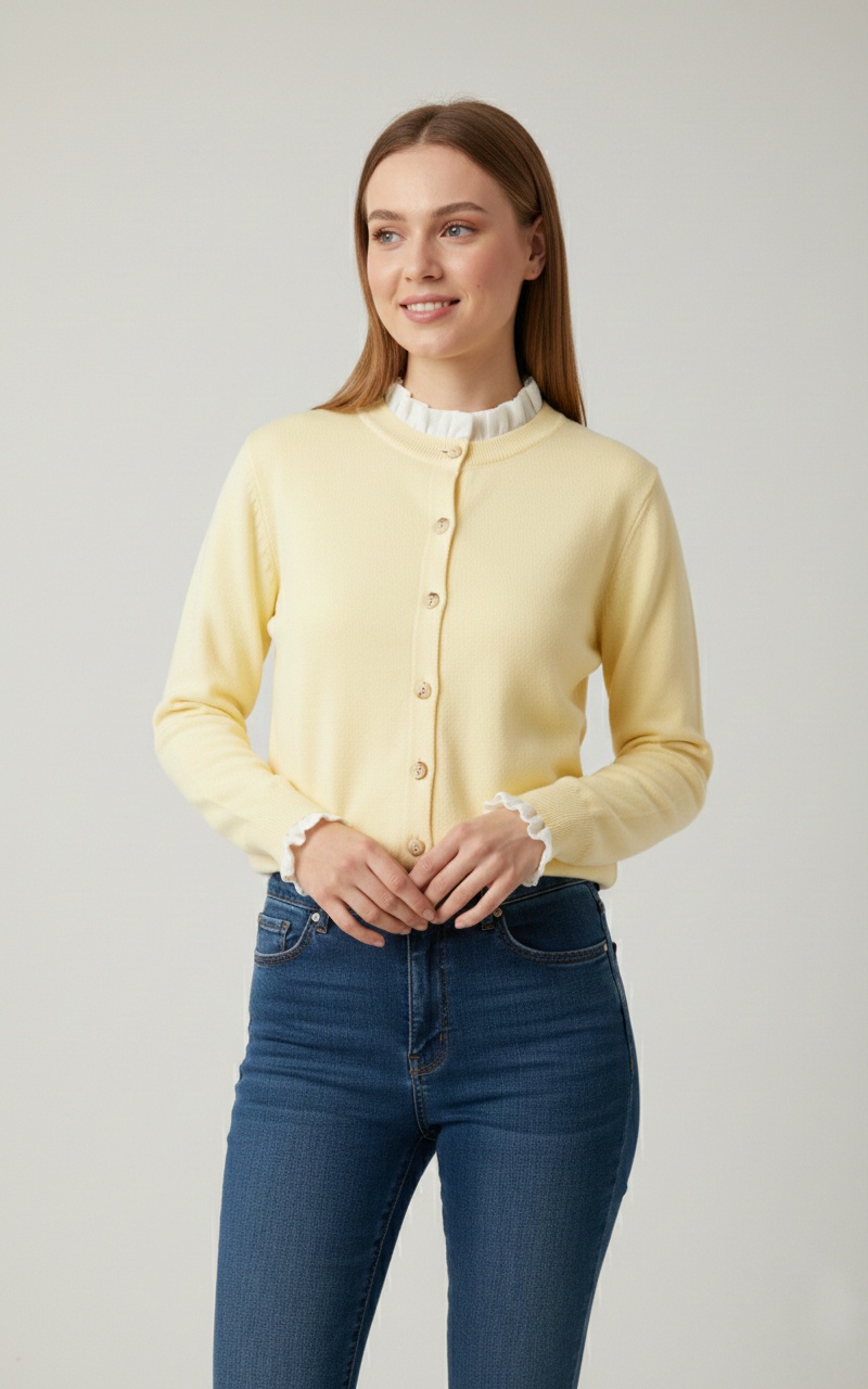Dale un toque de dulzura y sofisticación a tu armario con nuestro cárdigan de punto fino en tono amarillo pastel. Esta pieza combina la sencillez de una chaqueta clásica con detalles románticos que marcan la diferencia.