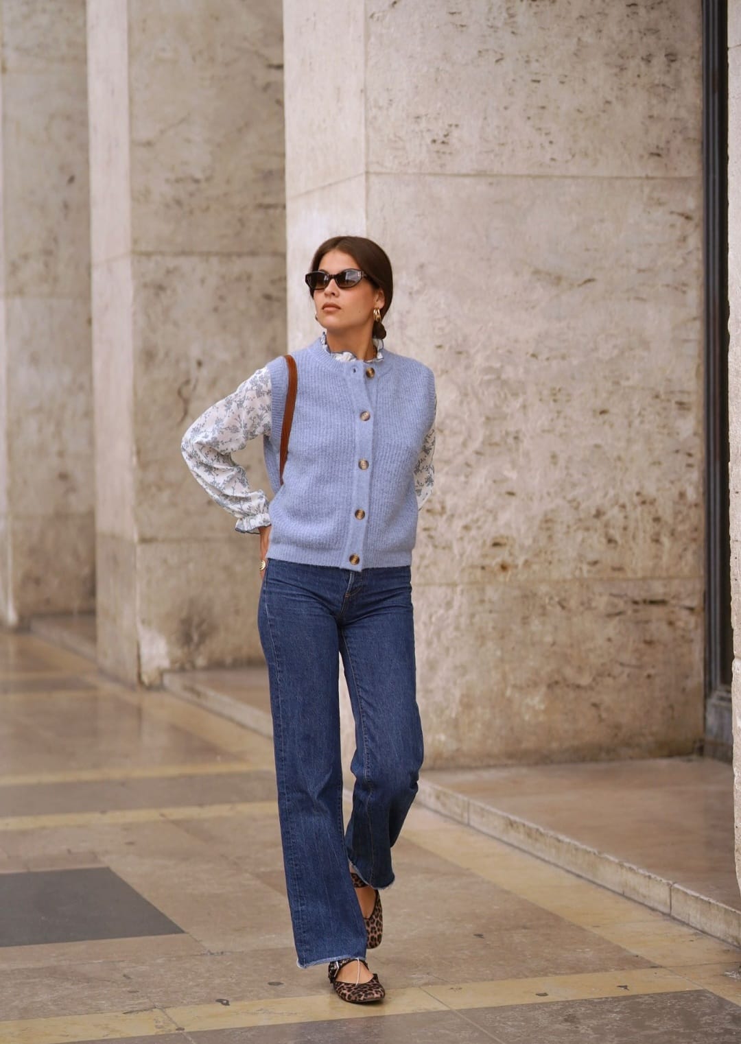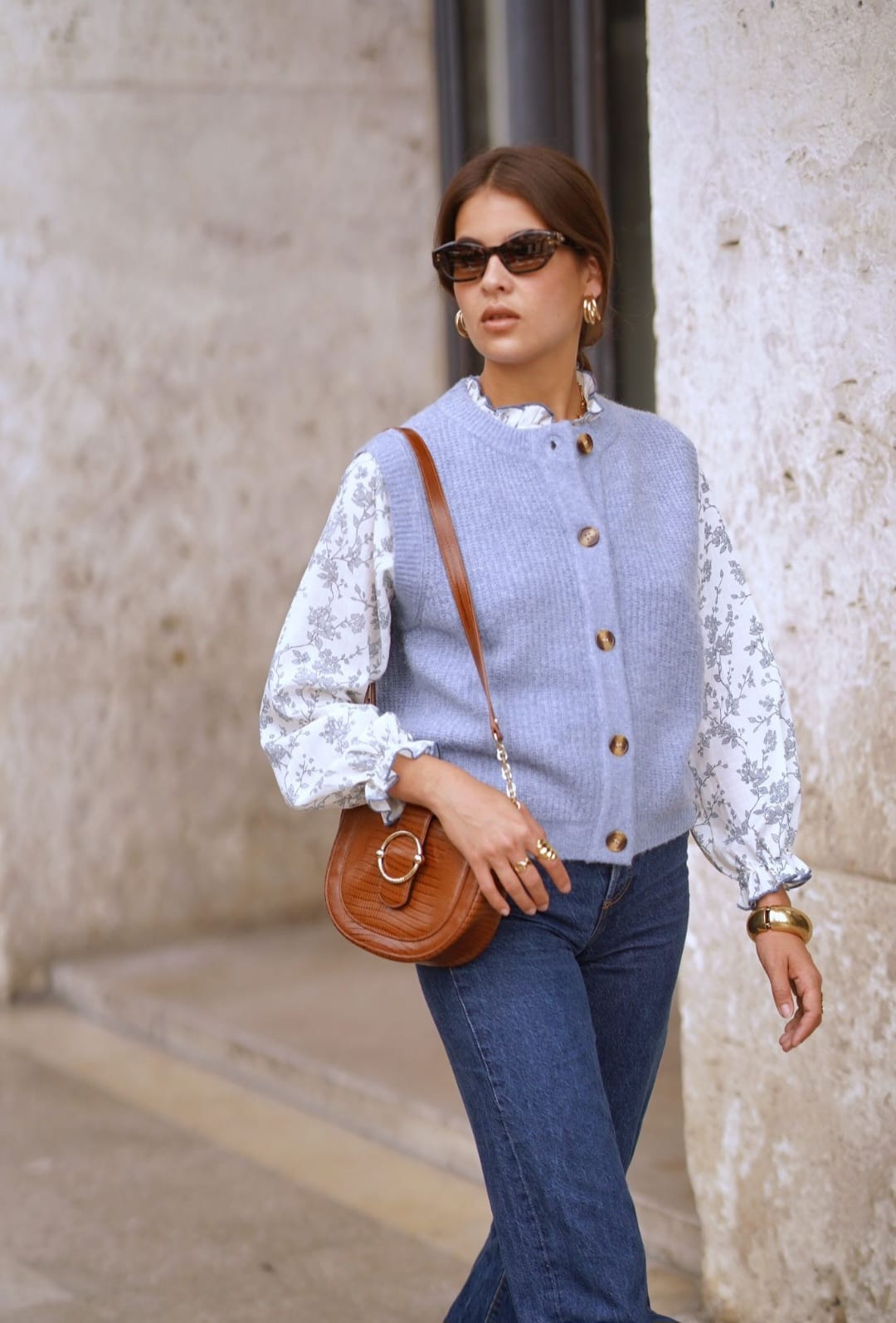 Chaleco de punto color azul celeste con cuello redondo y cierre de botones en color marrón.