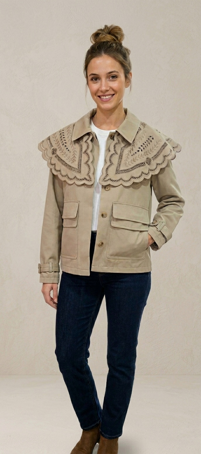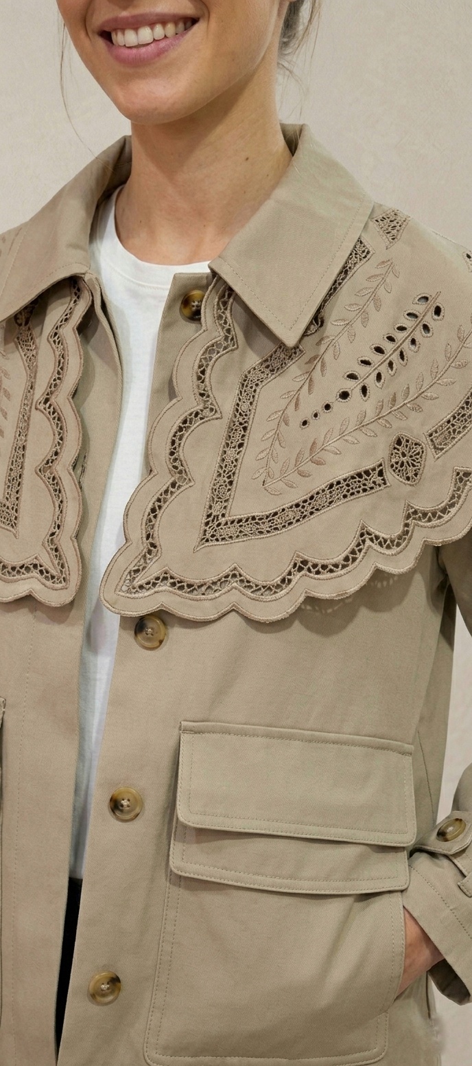Dale un giro sofisticado a tus looks de entretiempo con nuestra chaqueta tipo sahariana, una pieza única que destaca por su espectacular cuello babero extra grande en forma de capa. El detalle de los bordados troquelados y el acabado festoneado aportan un aire artesanal y femenino a una prenda de corte clásico.