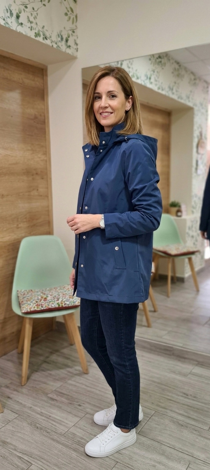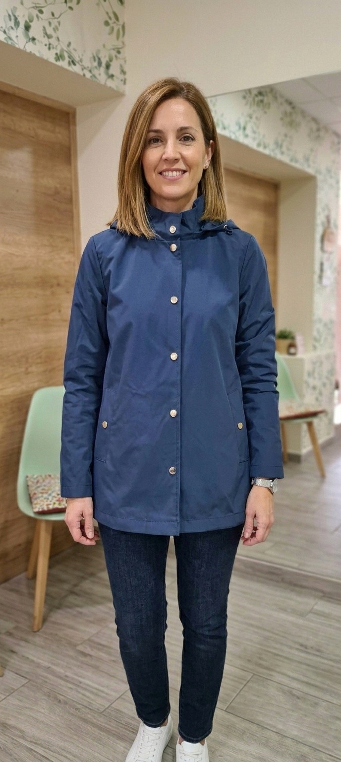 Dale un toque de sofisticación a tus días de lluvia o viento con nuestra chaqueta engomada en color azul marino. Es la prenda exterior definitiva que combina un diseño técnico con una estética urbana perfecta para el día a día.