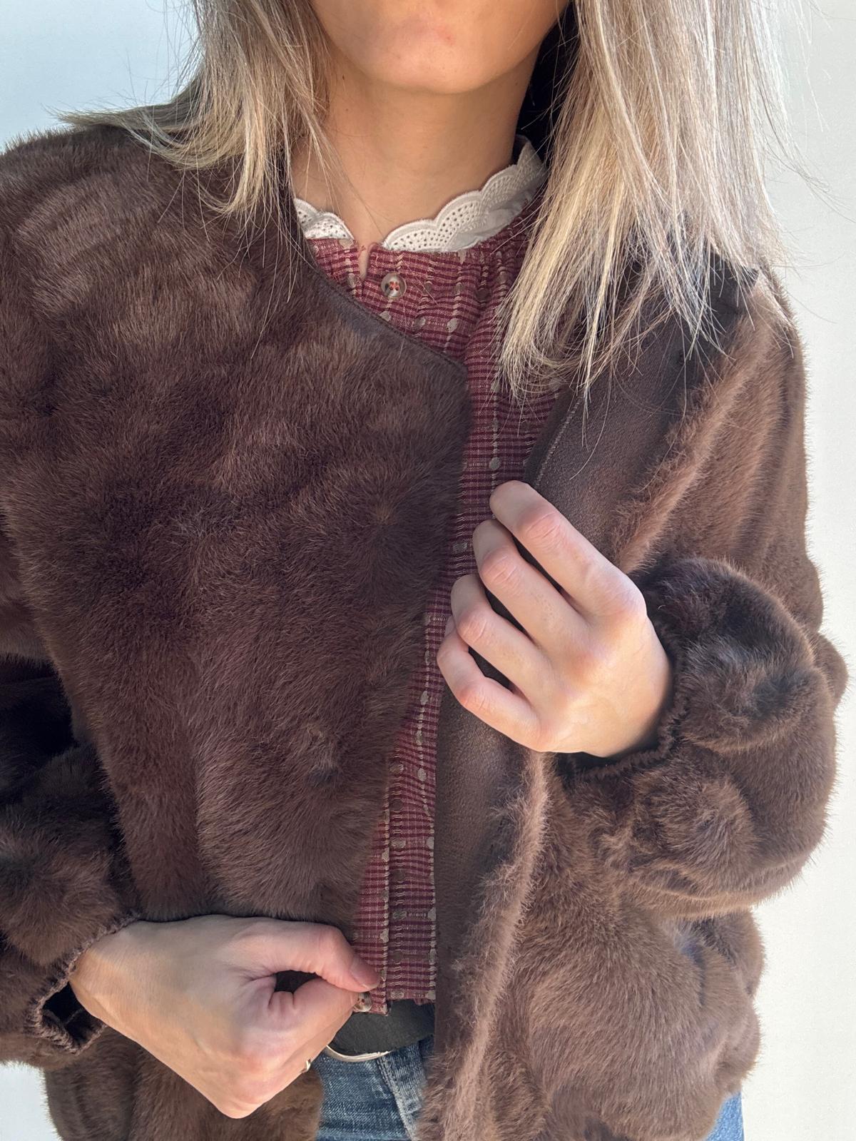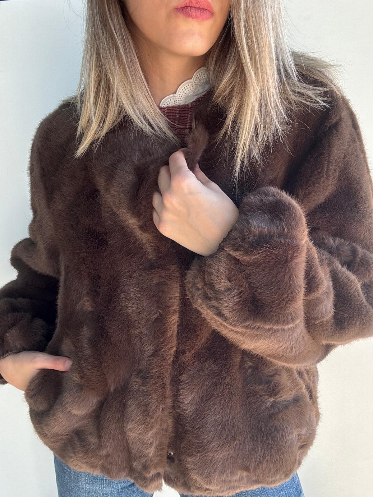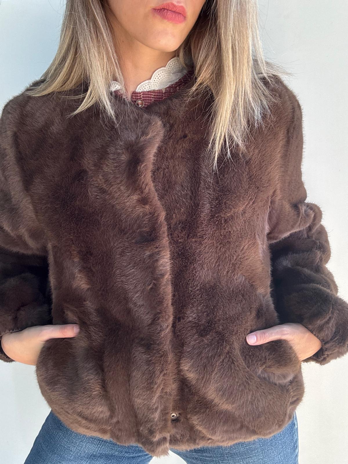 Chaqueta de pelo sintético de alta calidad muy suave al tacto en color marrón chocolate. Tiene corte estilo bomber, cuello redondo sin solapas, cierre de botones y bolsillos laterales. Tiene forro.