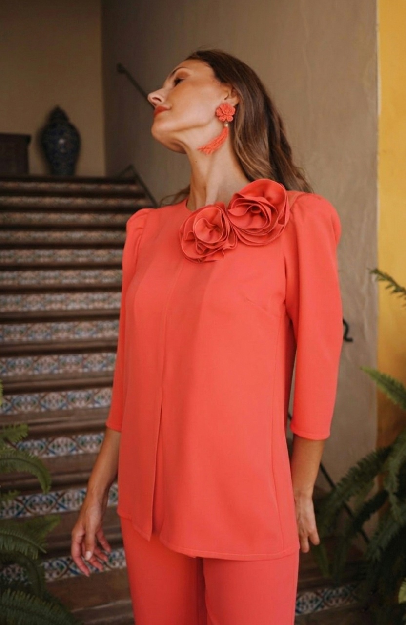 El Conjunto Adela es la elección perfecta para quienes buscan un equilibrio entre la sencillez de un traje de chaqueta y la feminidad de los detalles de alta costura. En un espectacular tono coral vibrante, este dos piezas está diseñado para eventos de día y celebraciones donde la elegancia y el color son los protagonistas.