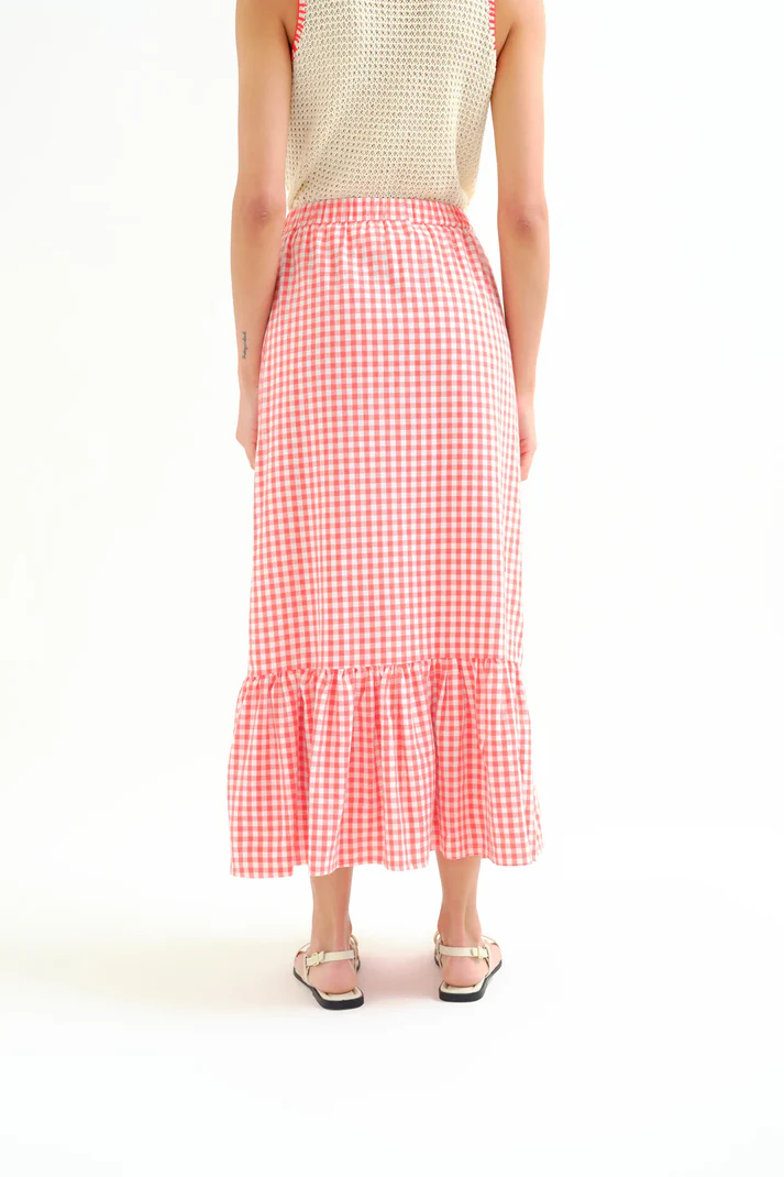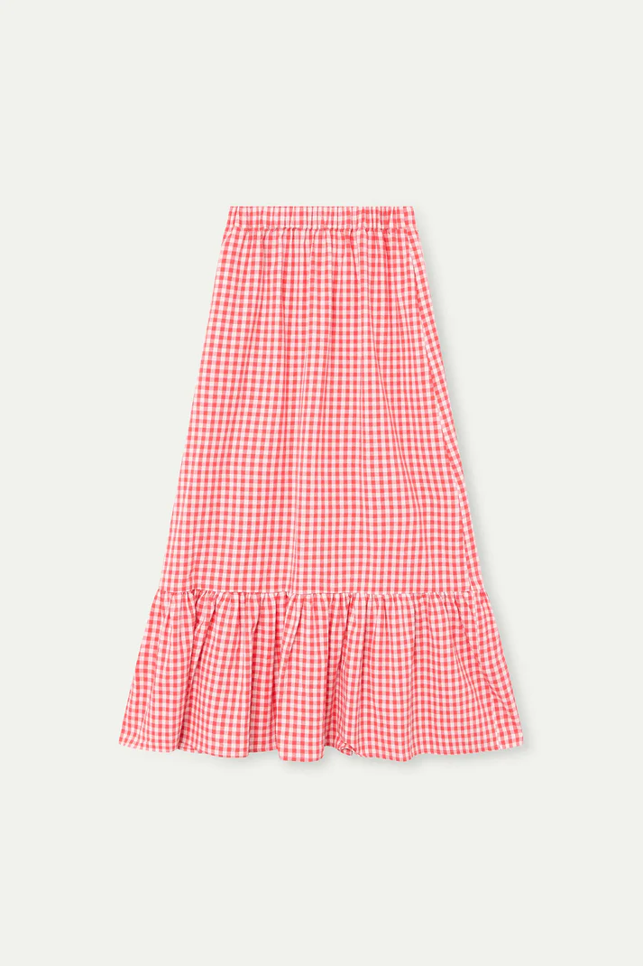 Falda de tejido 100% algodón vichy de color rojo. Cintura elástica de tiro alto. Falda con volante. Bolsillos laterales. La modelo mide 175 cm y lleva la talla S.