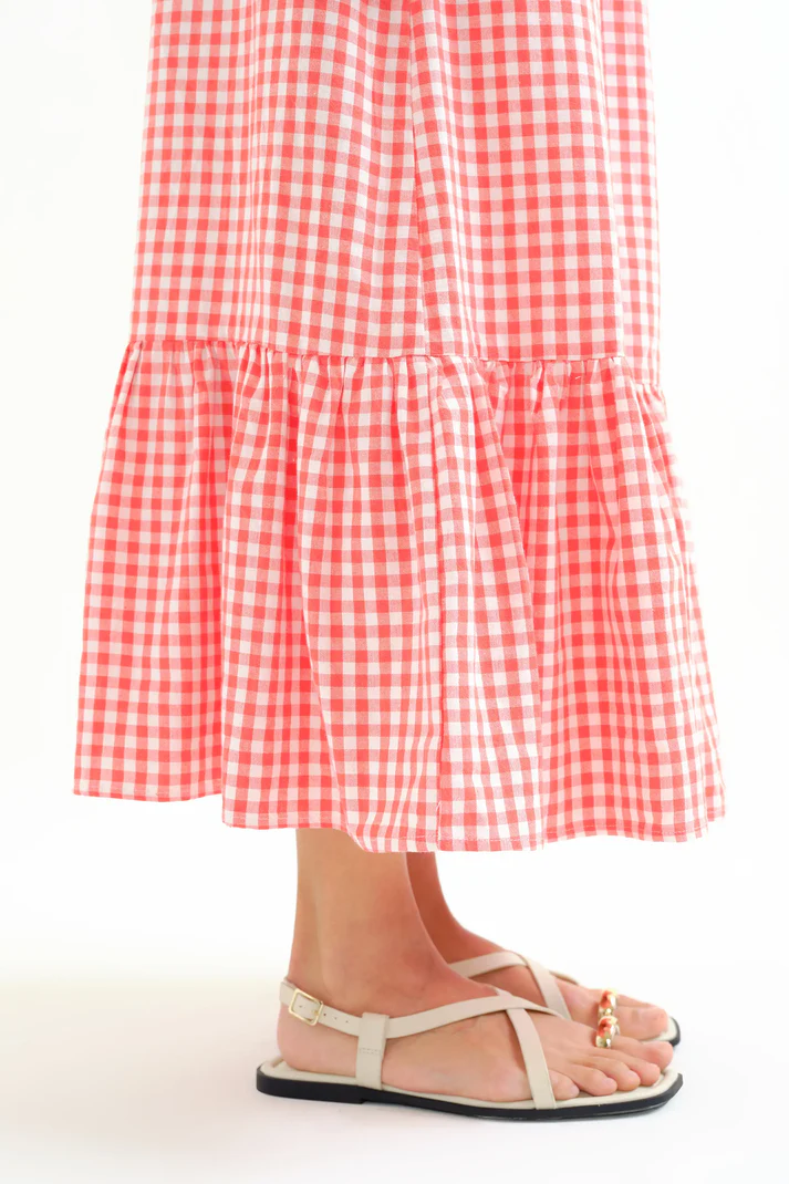 Estampado Clásico: El cuadro Vichy en rojo y blanco aporta un aire retro y atemporal que siempre favorece.