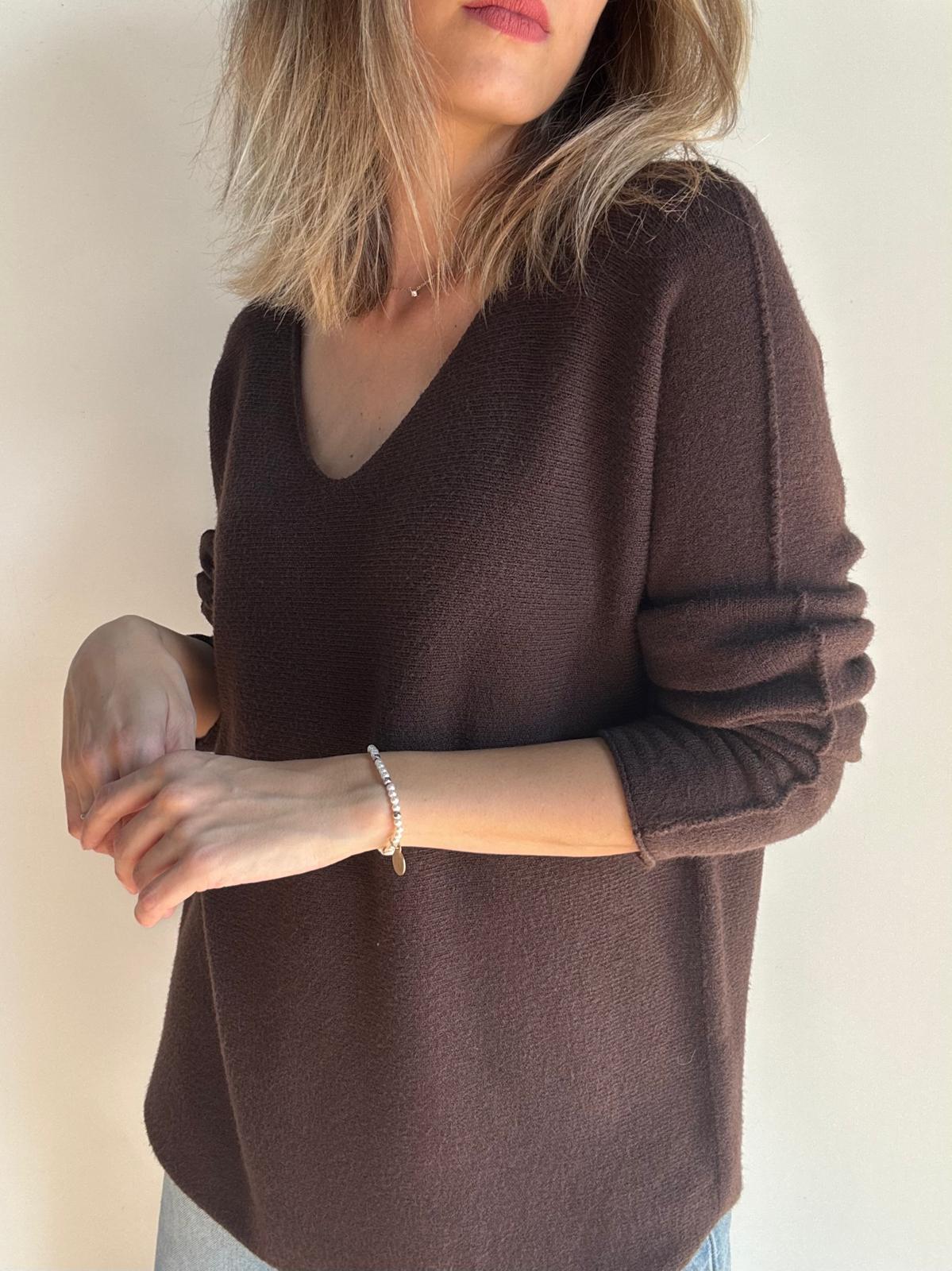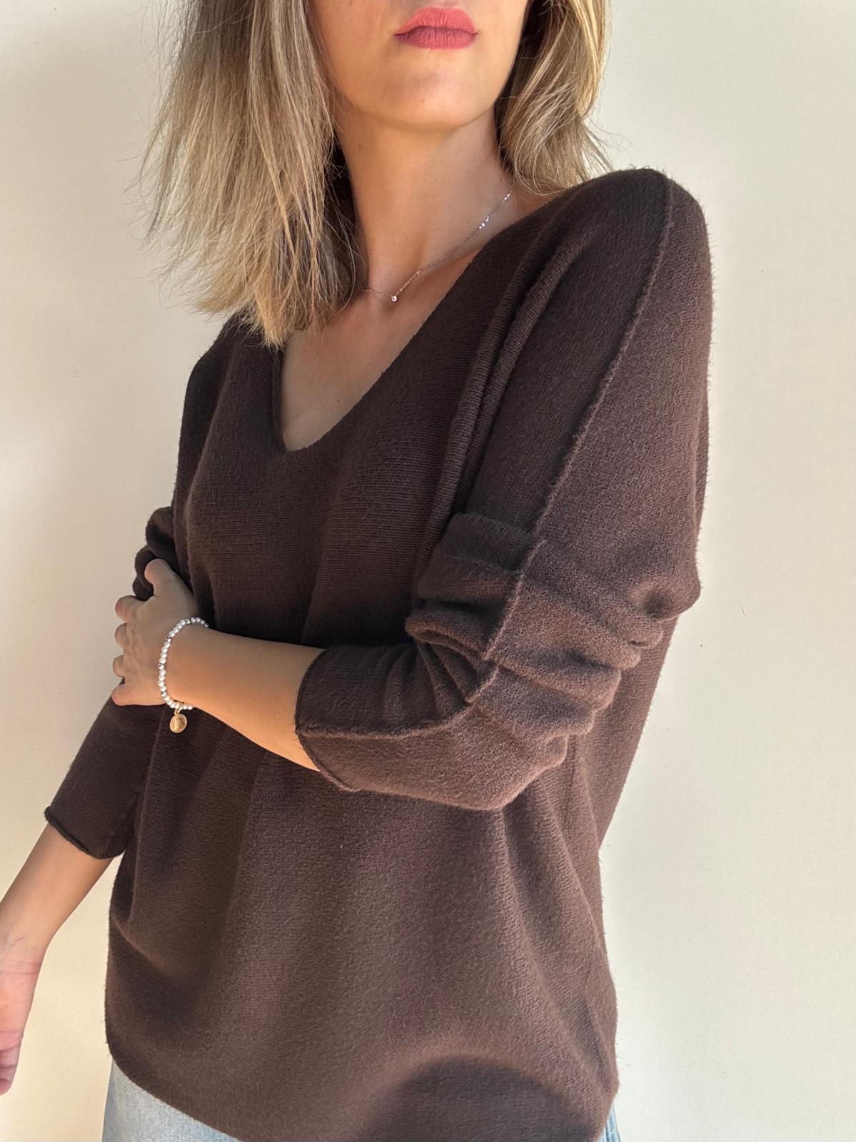 Jersey básico de manga larga y escote de pico en color marrón chocolate. Talla Única.