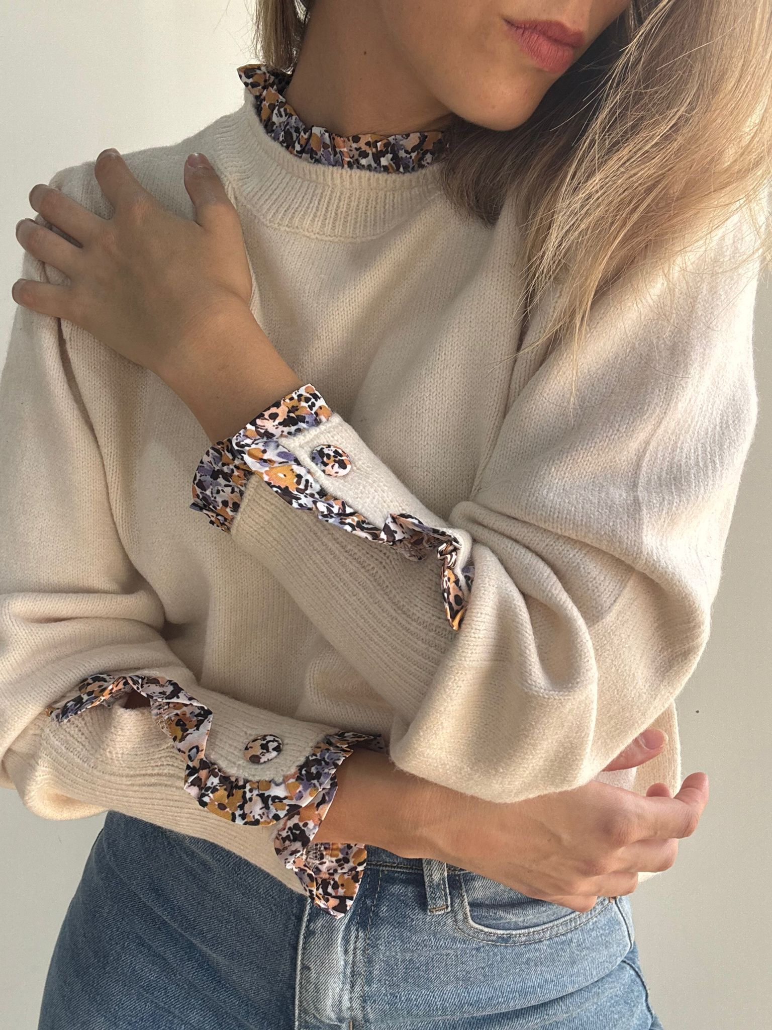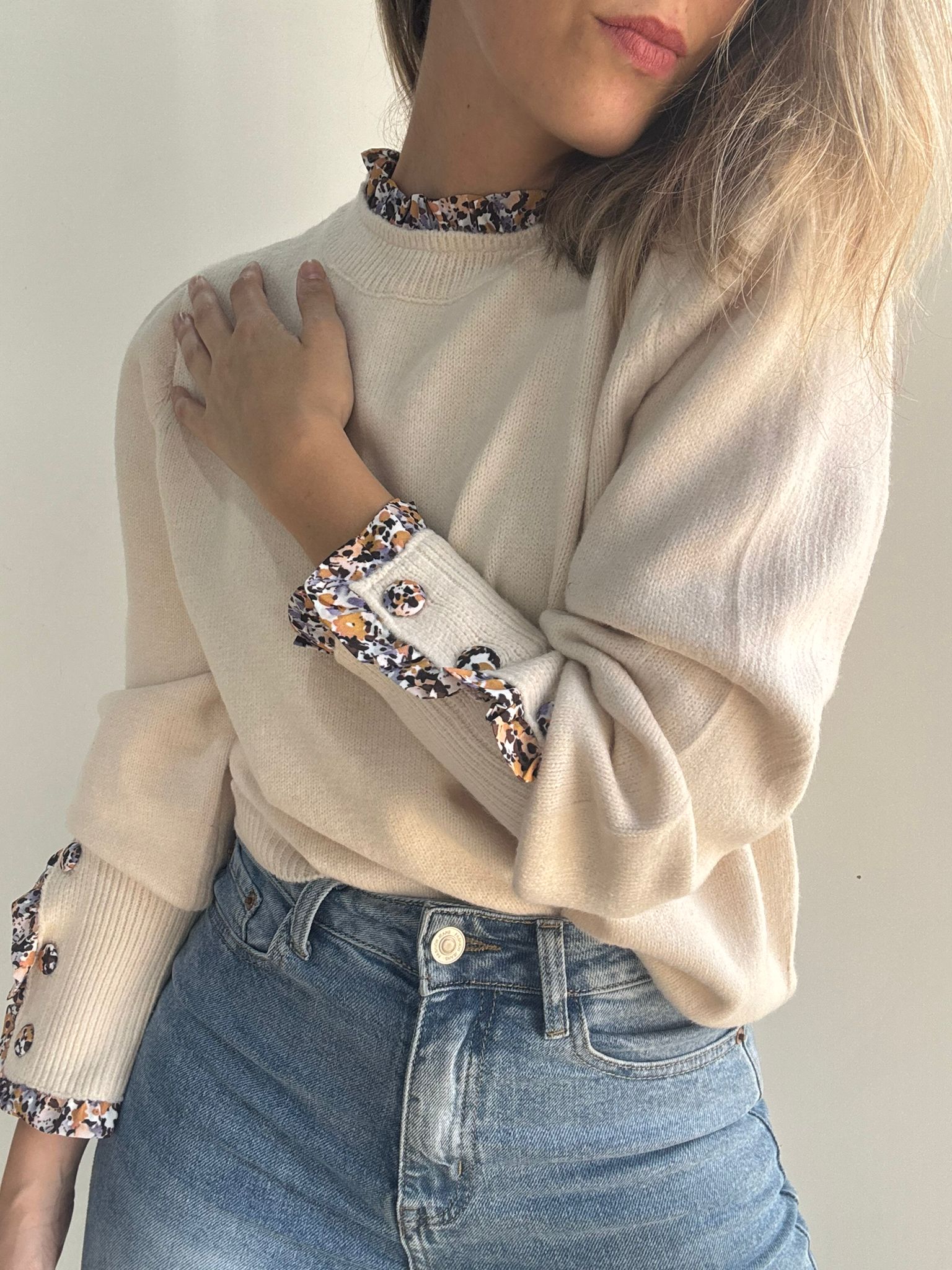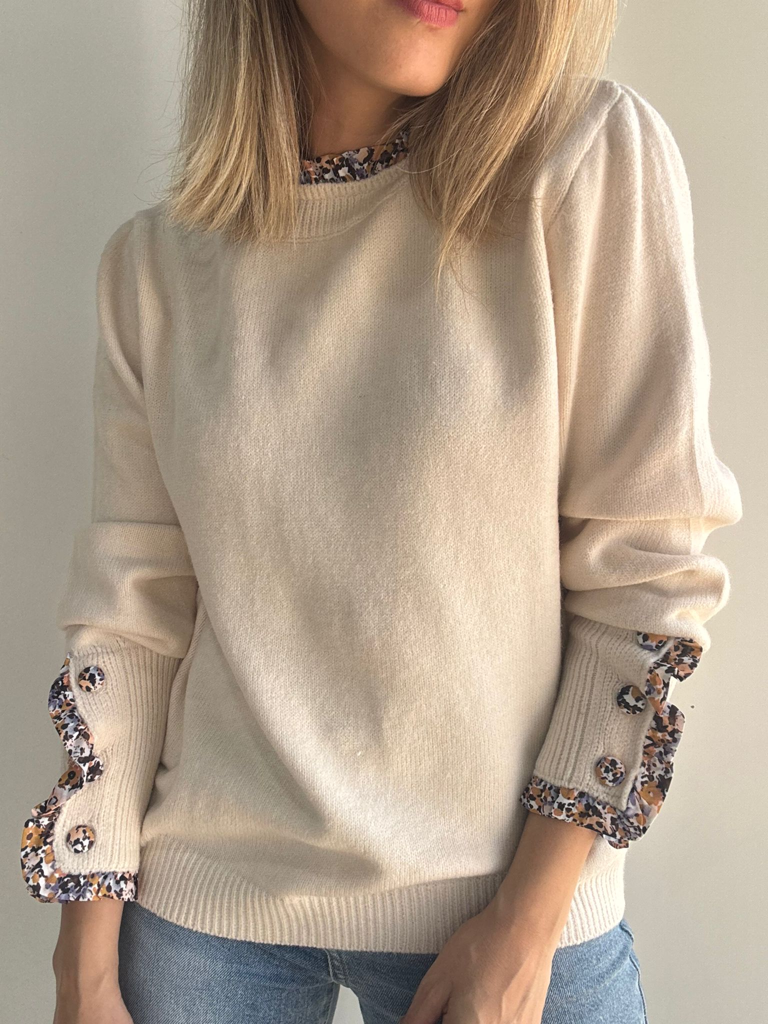 Jersey en color blanco de tacto suave con estampado floral en el cuello y en los puños con detalles de botones decorativos. Talla única.