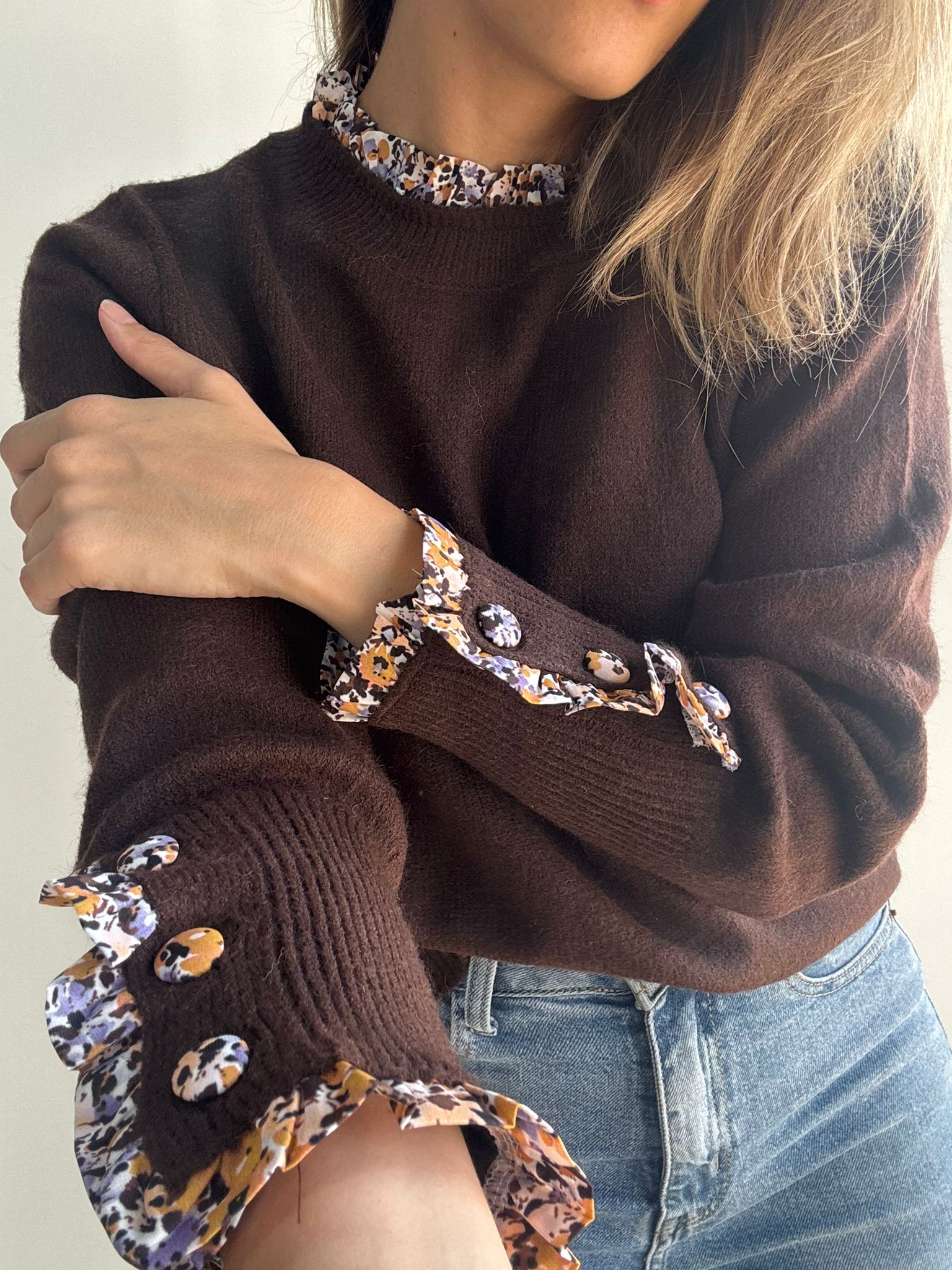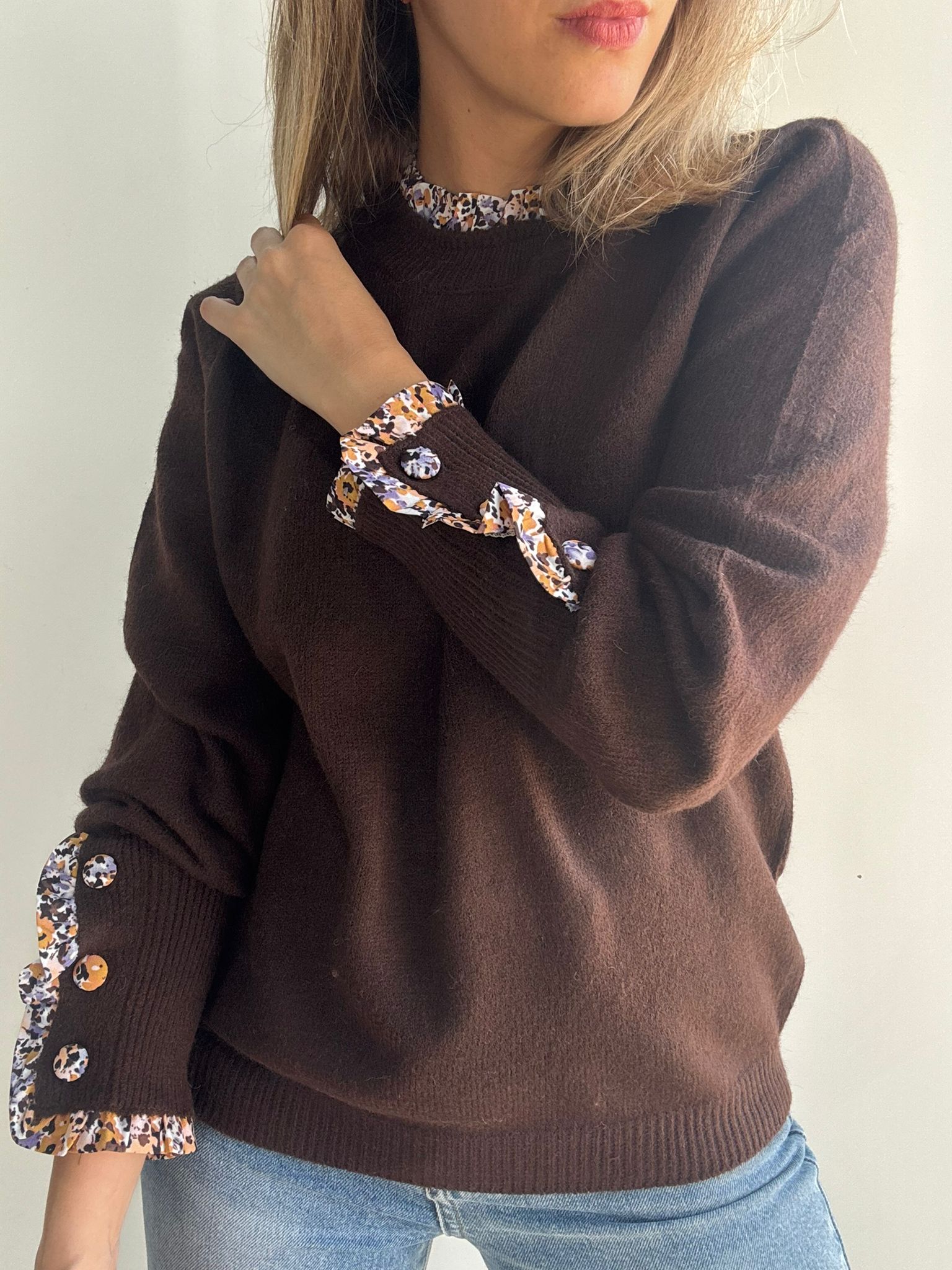 Jersey en color marrón chocolate de tacto suave con estampado floral en el cuello y en los puños con detalles de botones decorativos. Talla única.
