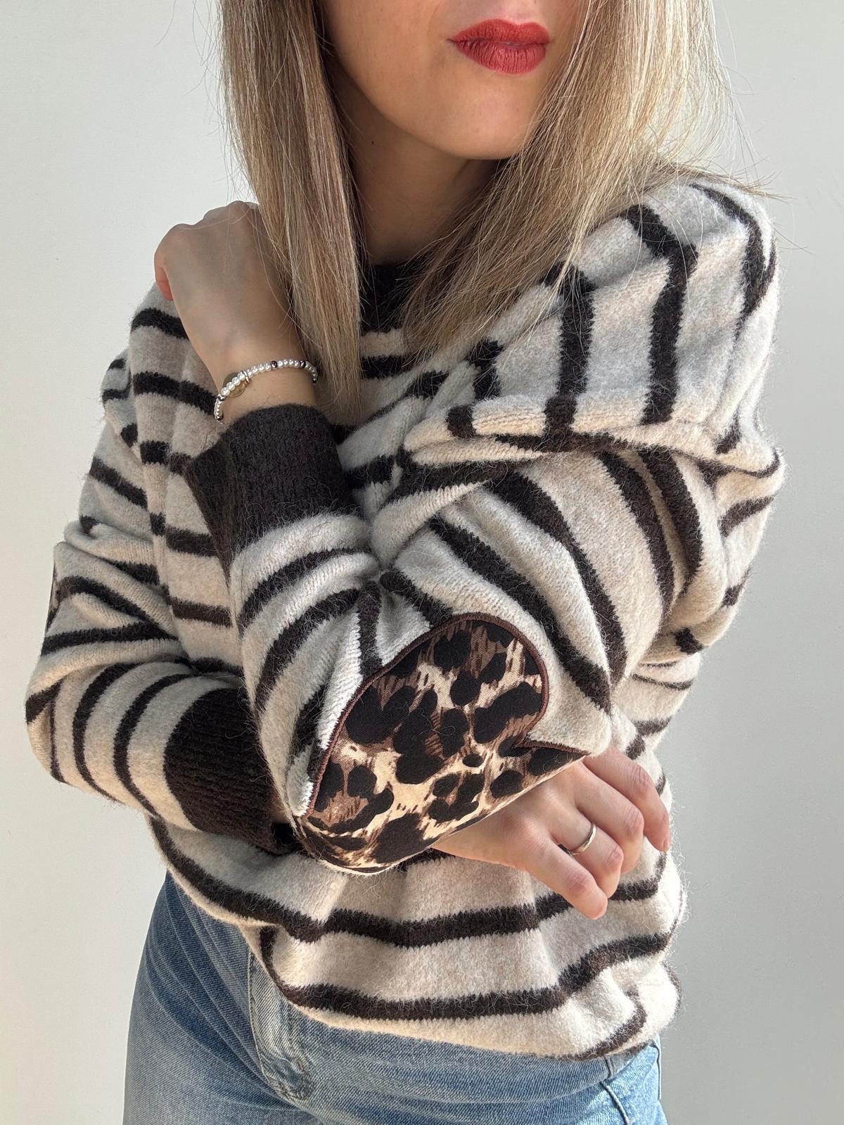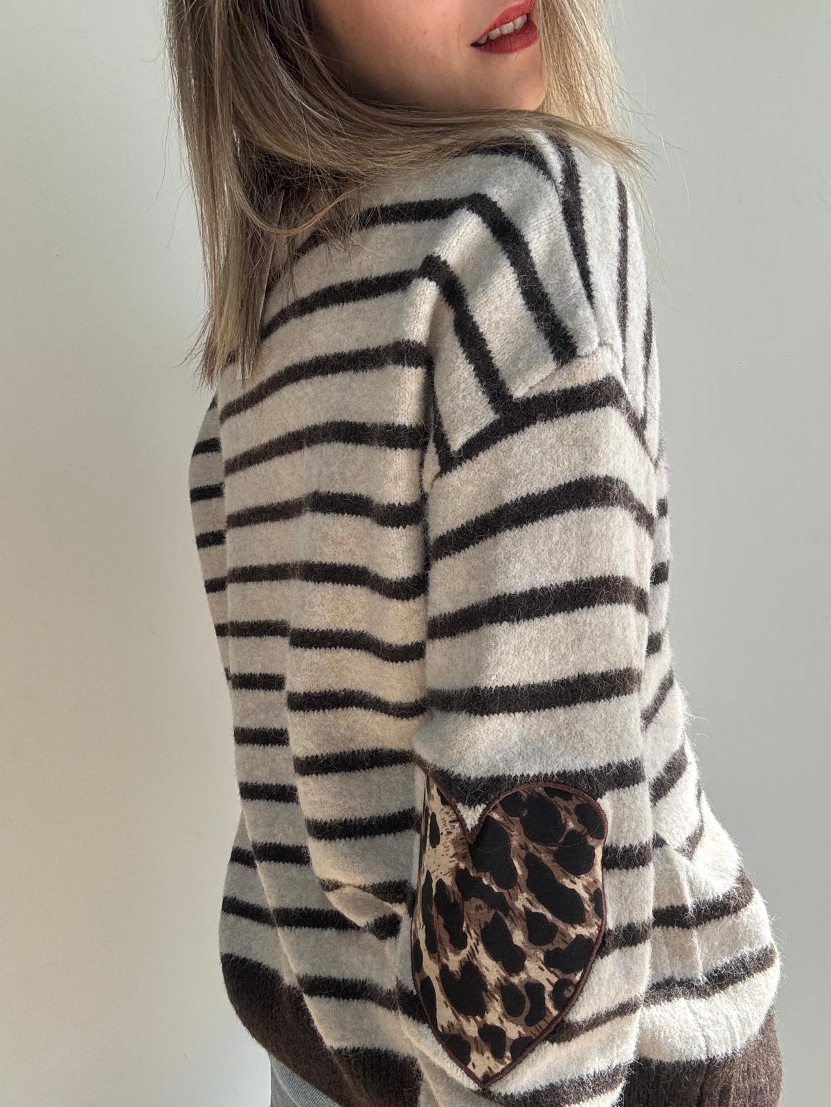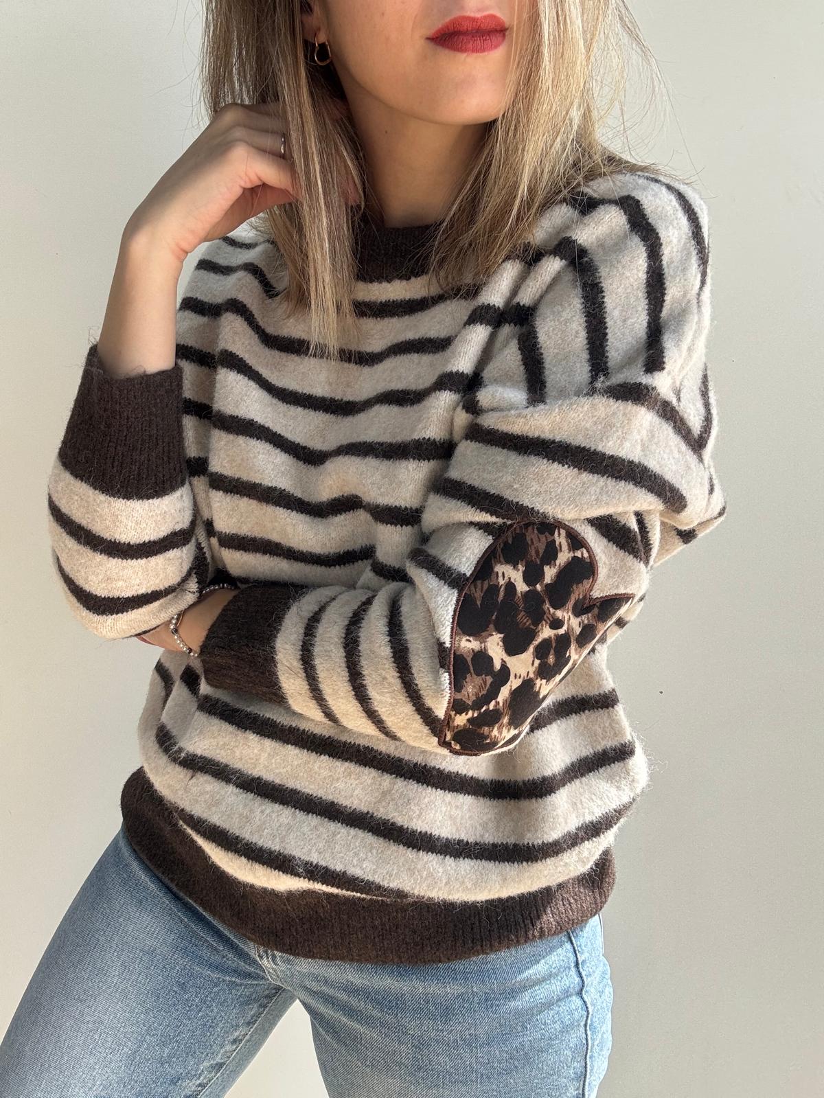 Jersey de tacto suave en color beige combinado con rayas marrón chocolate y detalle de coderas en forma de corazón en estampado print de leopardo. Tiene cuello redondo y los puños y el bajo del jersey están rematados con un punto más ajustado. Talla única.