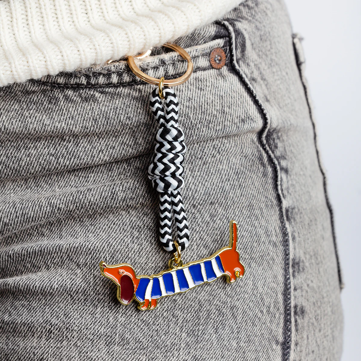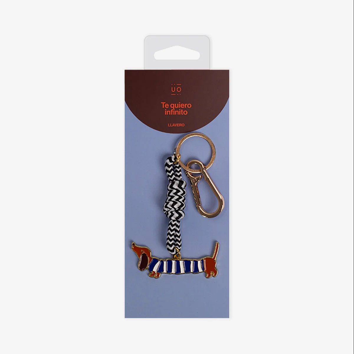 Llavero de Diseño: Un accesorio metálico de alta calidad con un cordón trenzado en blanco y negro y el dije del perrito salchicha con su jersey a rayas. ¡Para llevar ese mensaje especial a todas partes!