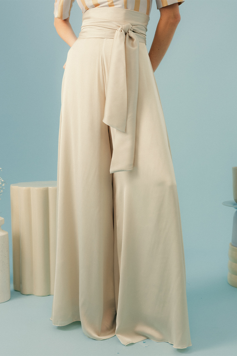Descubre la comodidad y el estilo con nuestro moderno Pantalón de Pierna Ancha con Lazo en la Cintura. Hecho de un suave satén beige con un acabado satinado, este pantalón ofrece un ajuste relajado y favorecedor con su silueta de pierna ancha.