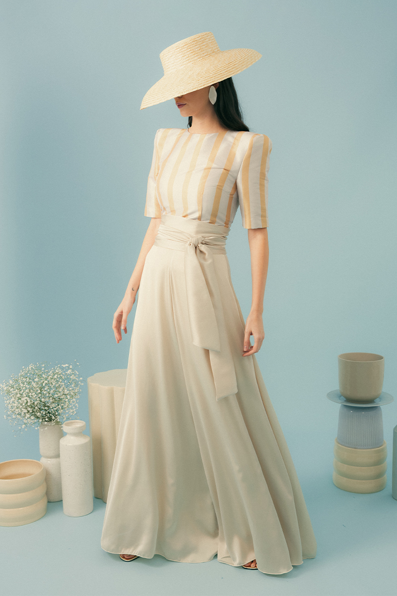 Eleva tu estilo con nuestro sofisticado Pantalón Palazzo Capri. Confeccionado en un lujoso satén beige claro con un brillo sutil, este pantalón presenta una silueta fluida y de pierna ancha que estiliza y aporta movimiento. Su talle alto con cinturón de lazo ajustable define la cintura para un ajuste personalizado y favorecedor. Ideal para ocasiones especiales, eventos formales o para añadir un toque de distinción a tus looks diarios. Combínalo con una blusa de seda y tacones para un conjunto impecable.