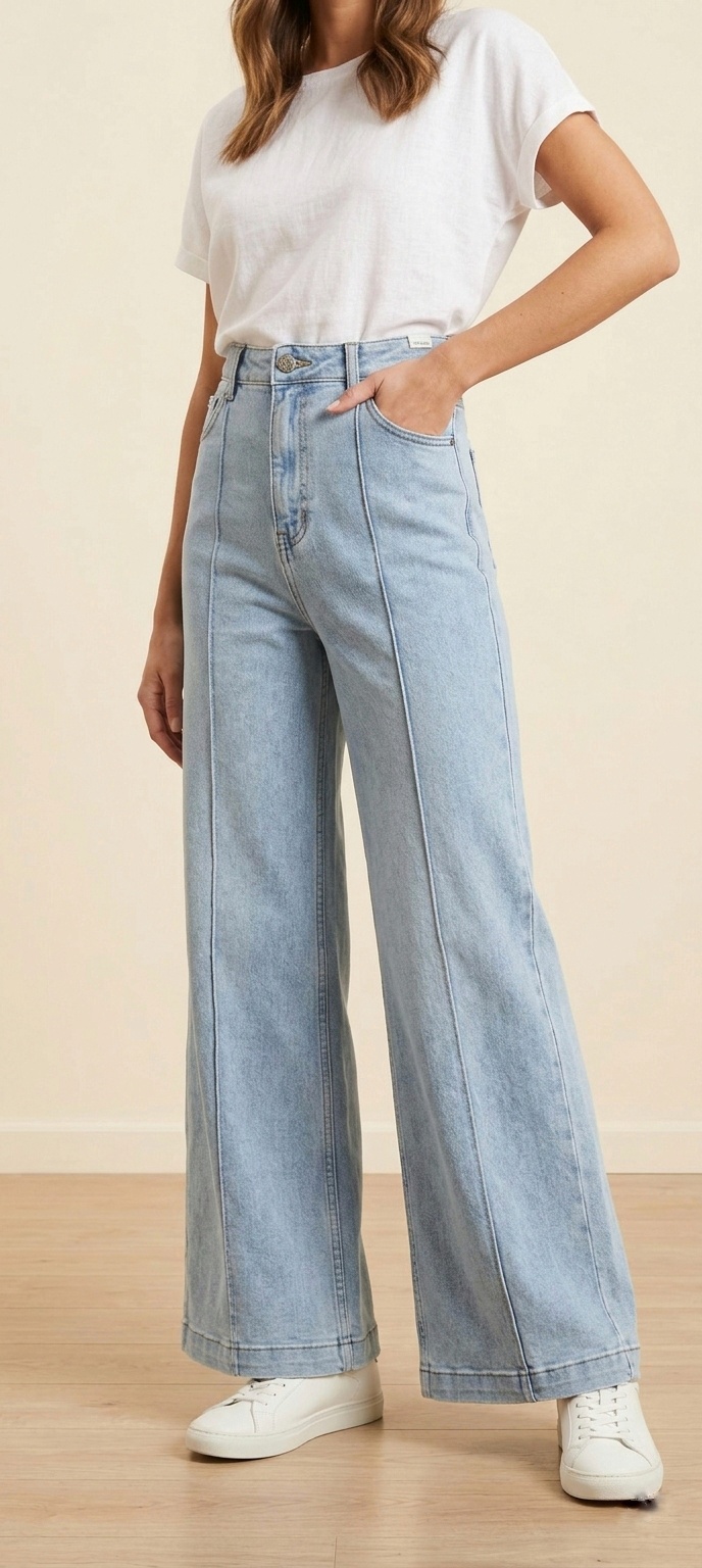 Eleva tu estilo cotidiano con nuestros jeans de corte ancho, diseñados para ofrecer el equilibrio perfecto entre la comodidad del denim y una silueta sofisticada. Su detalle de costura frontal es el toque definitivo para alargar visualmente la figura.