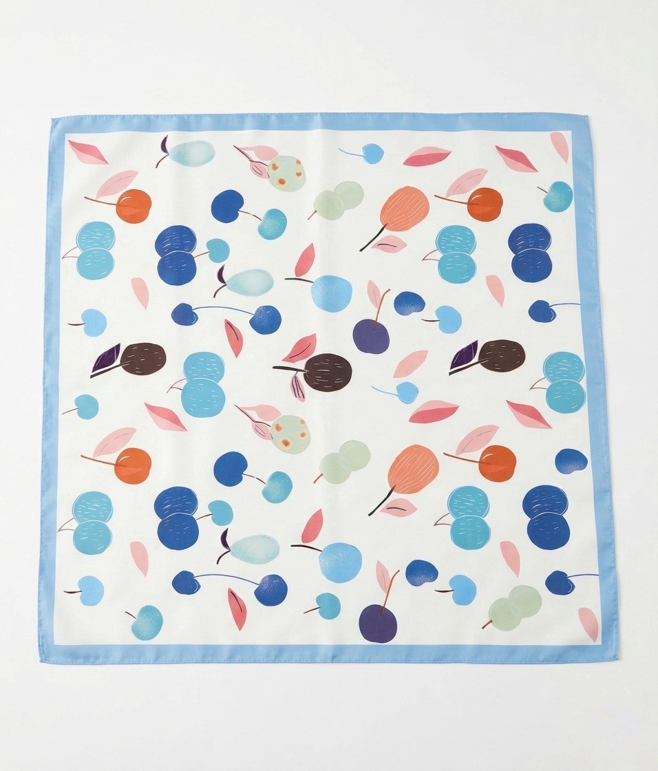 Añade un toque de frescura y sofisticación a tu look con nuestro pañuelo de diseño exclusivo. Este accesorio destaca por su vibrante estampado de cerezas abstractas en una paleta de colores equilibrada que mezcla tonos azules, corales y neutros sobre un fondo blanco nítido.