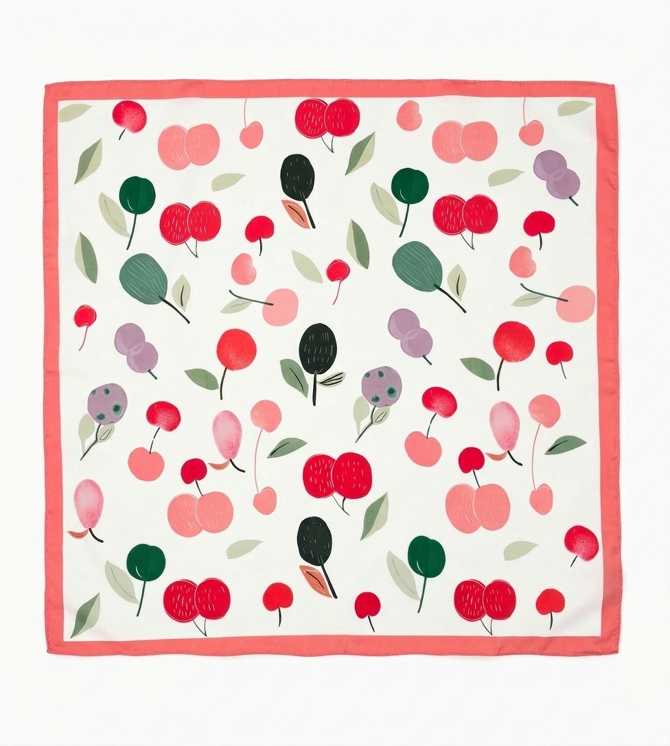Añade un toque de frescura y sofisticación a tu look con nuestro pañuelo de diseño exclusivo. Este accesorio destaca por su vibrante estampado de cerezas abstractas en una paleta de colores equilibrada que mezcla tonos rojo, rosa y neutros sobre un fondo blanco nítido.