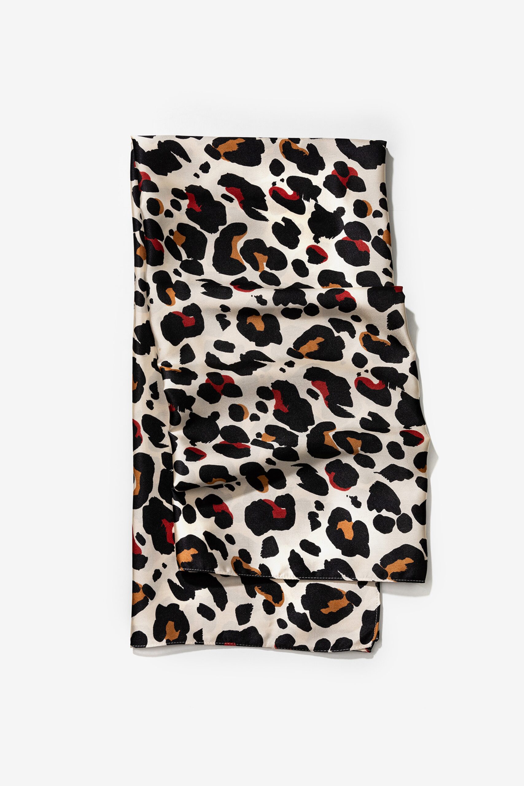 Pañuelo rectangular estampado de animal print en color negro y rojo.