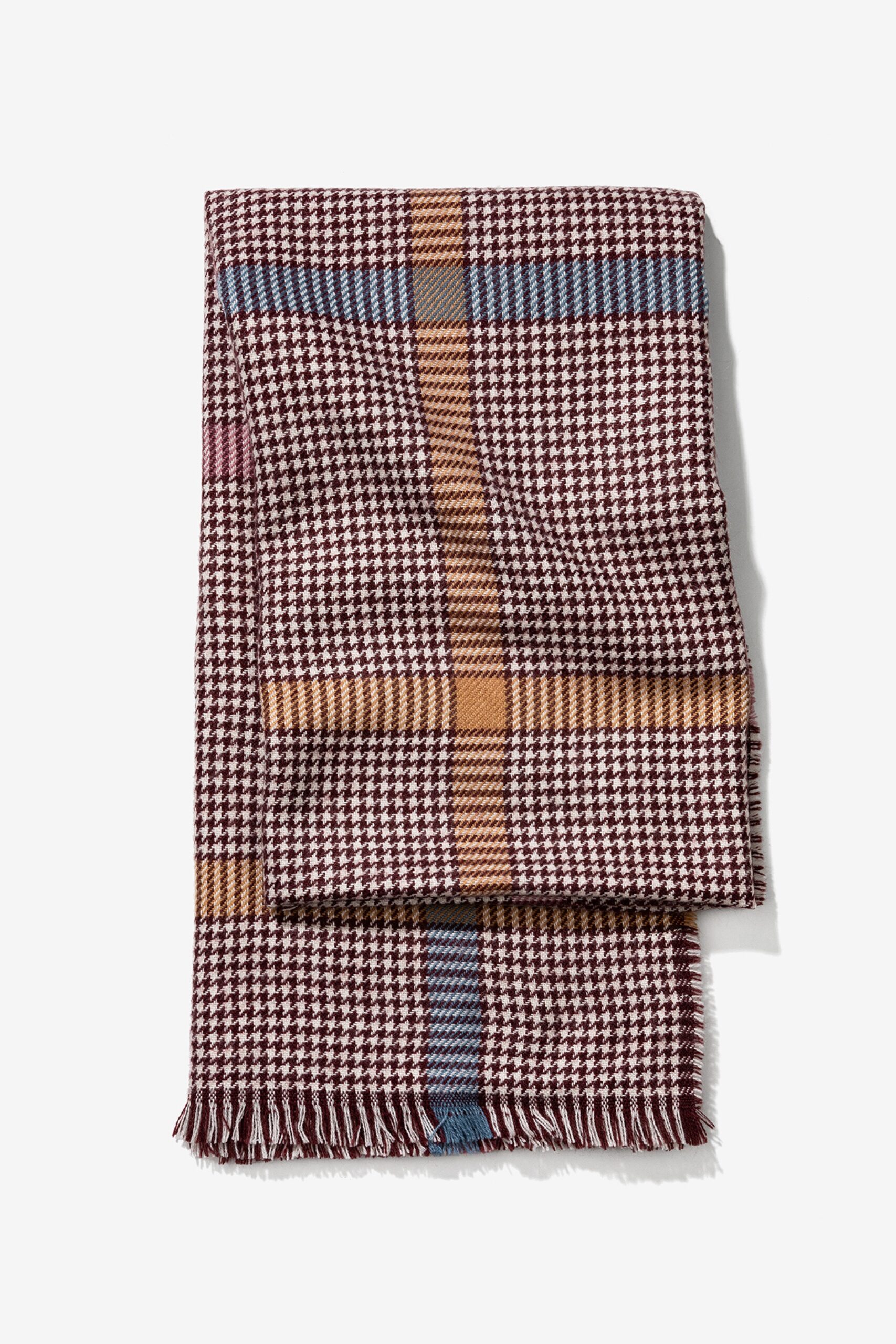 Pañuelo rectangular tipo bufanda estampado en pata de gallo color burdeos con acabado desflecado.