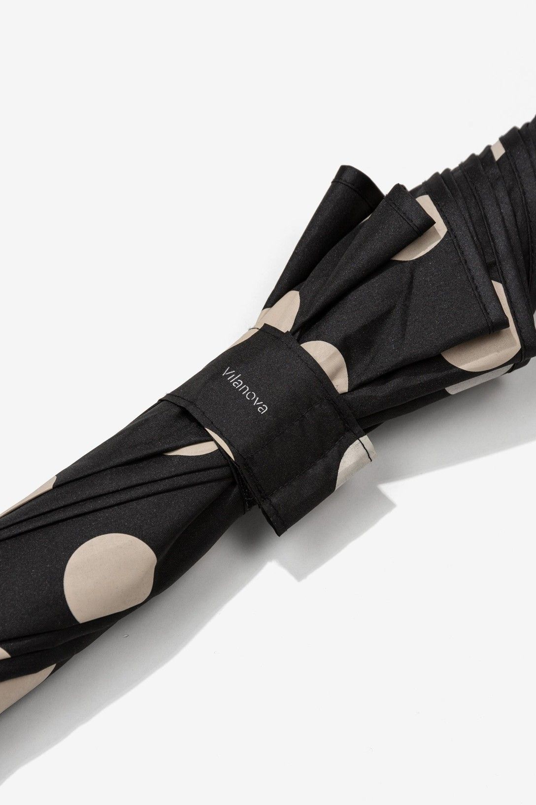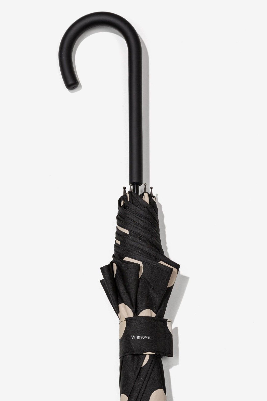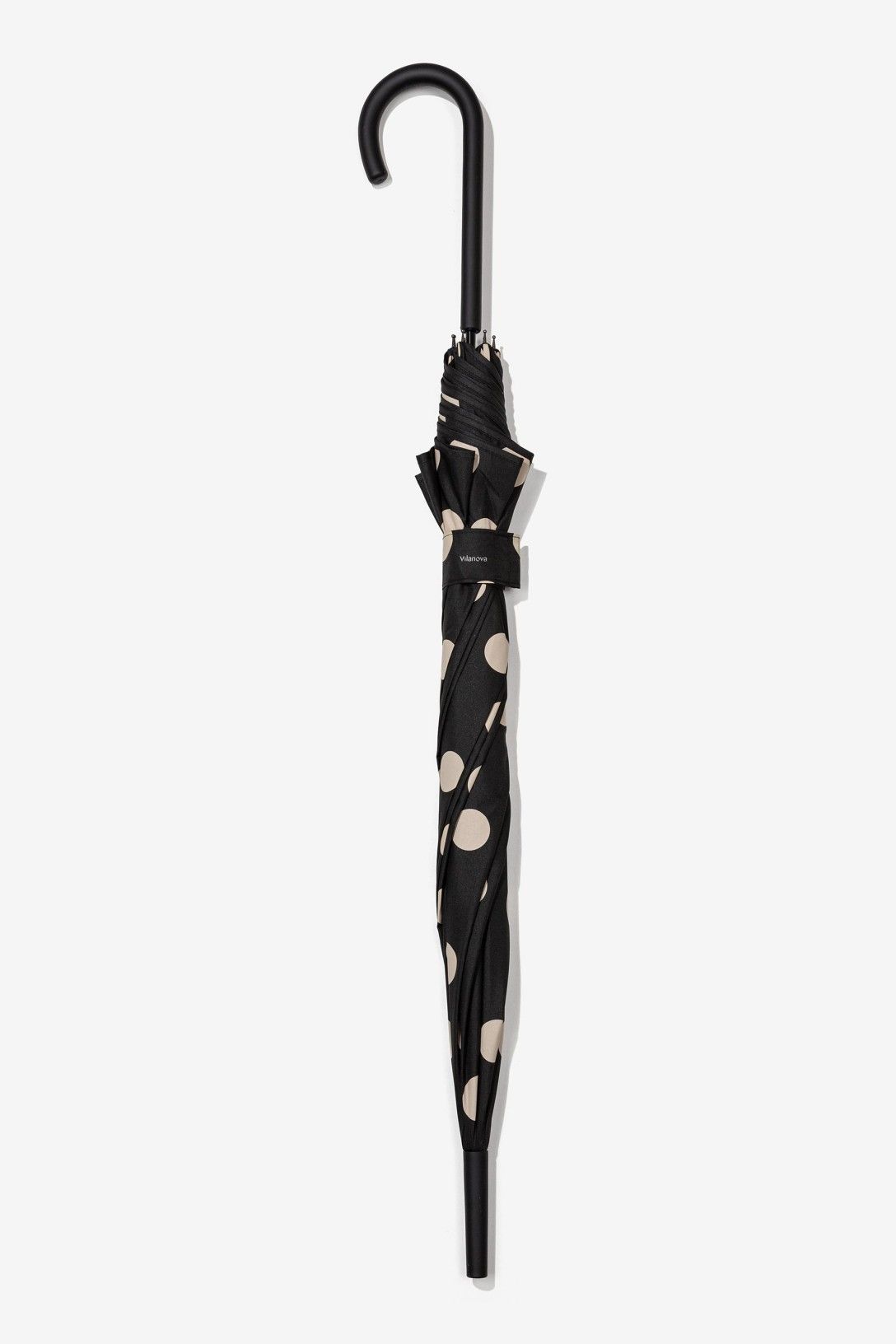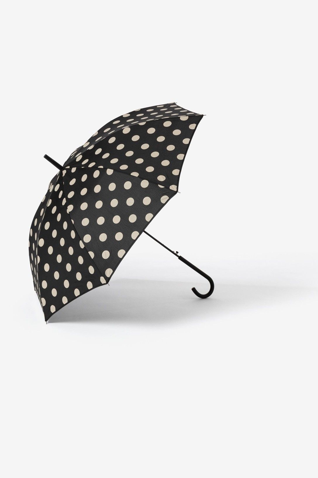 Paraguas grande con estampado de lunares color negro. Apertura y cierre manuales.