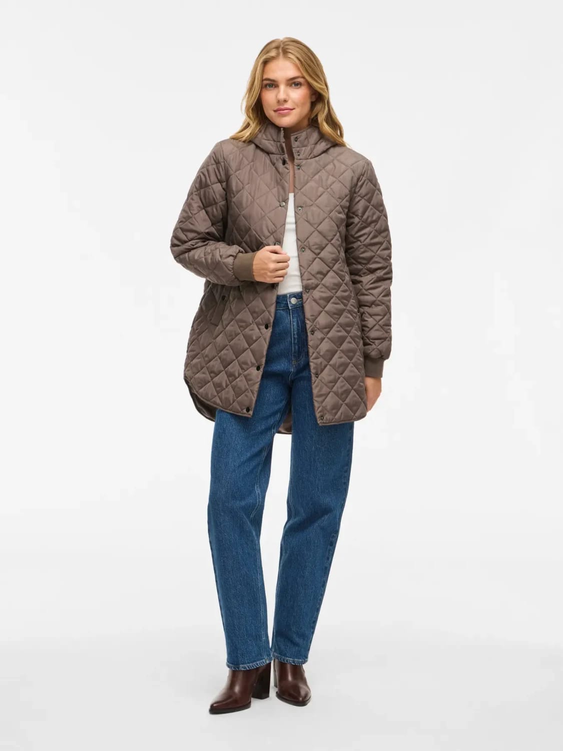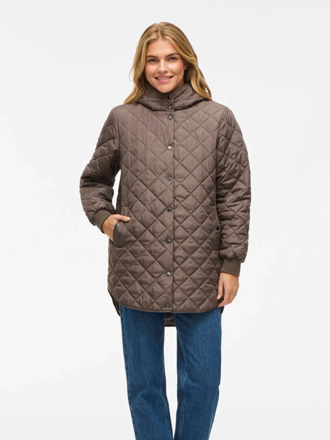 Parka guateada en color taupe 3/4 con puño en las mangas, capucha, bolsillos y cierre de botones.