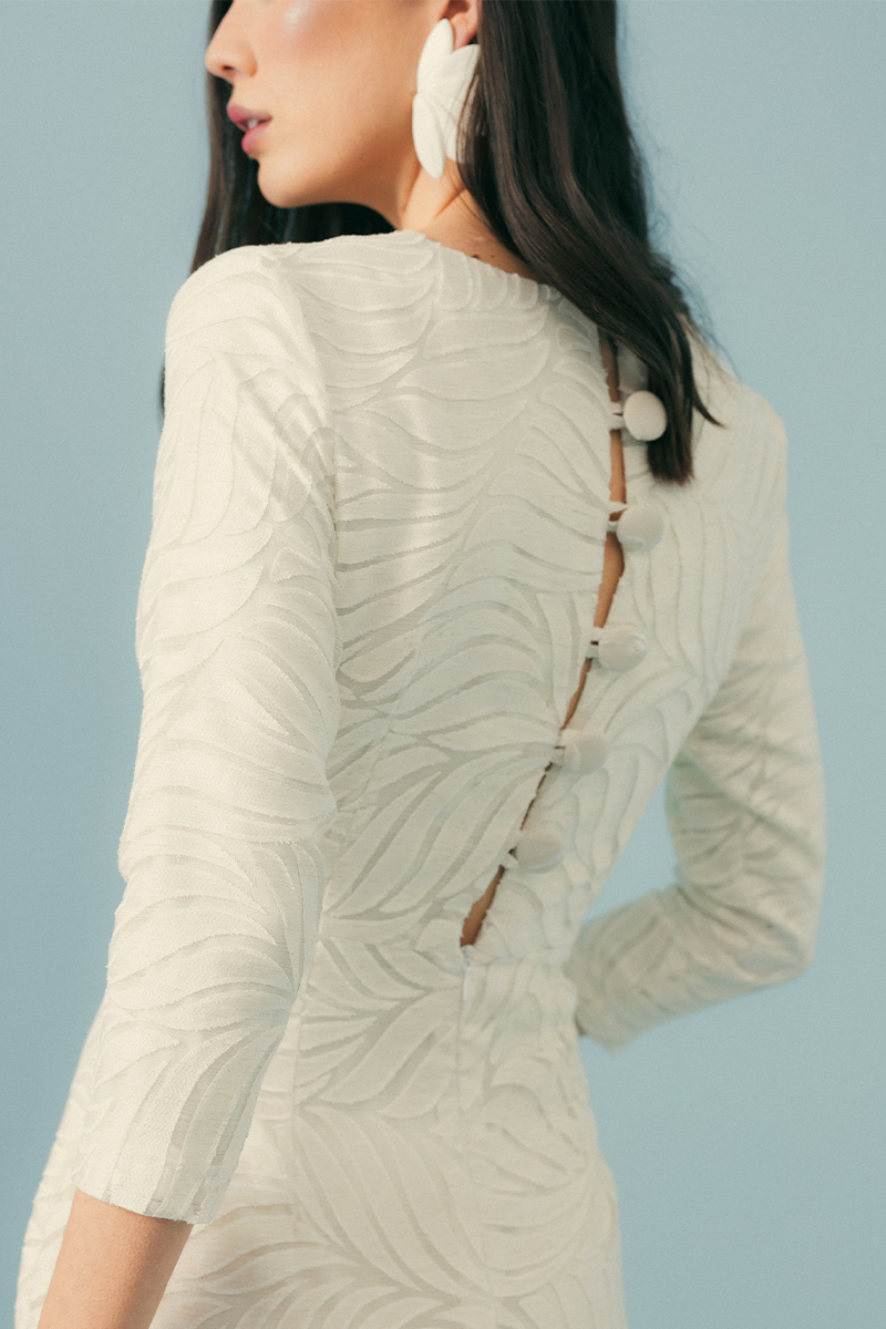 Espalda de Impacto: El verdadero protagonista es el cierre posterior. Una hilera de botones forrados dispuestos sobre una abertura vertical que deja ver la piel de forma sofisticada y sugerente.