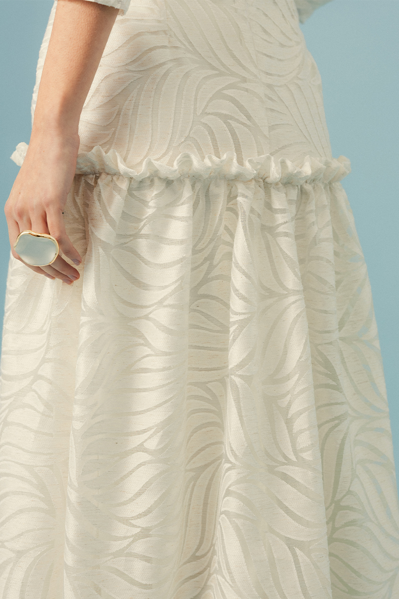 Eleva tu estilo con el Vestido Alcora, una pieza de diseño arquitectónico confeccionada en un exquisito tejido jacquard con relieve. Su patrón de hojas orgánicas crea un juego de sombras y texturas que aporta movimiento visual sin necesidad de accesorios recargados.