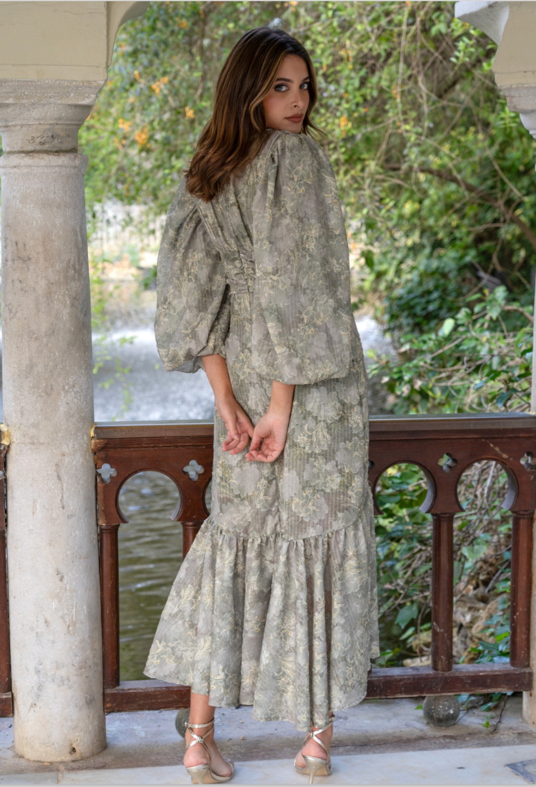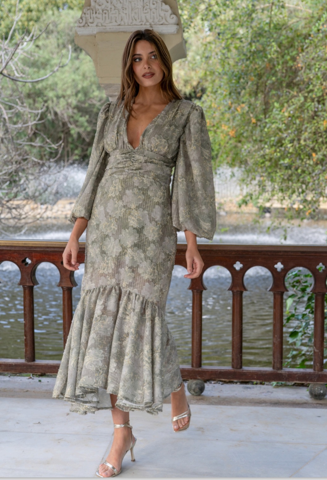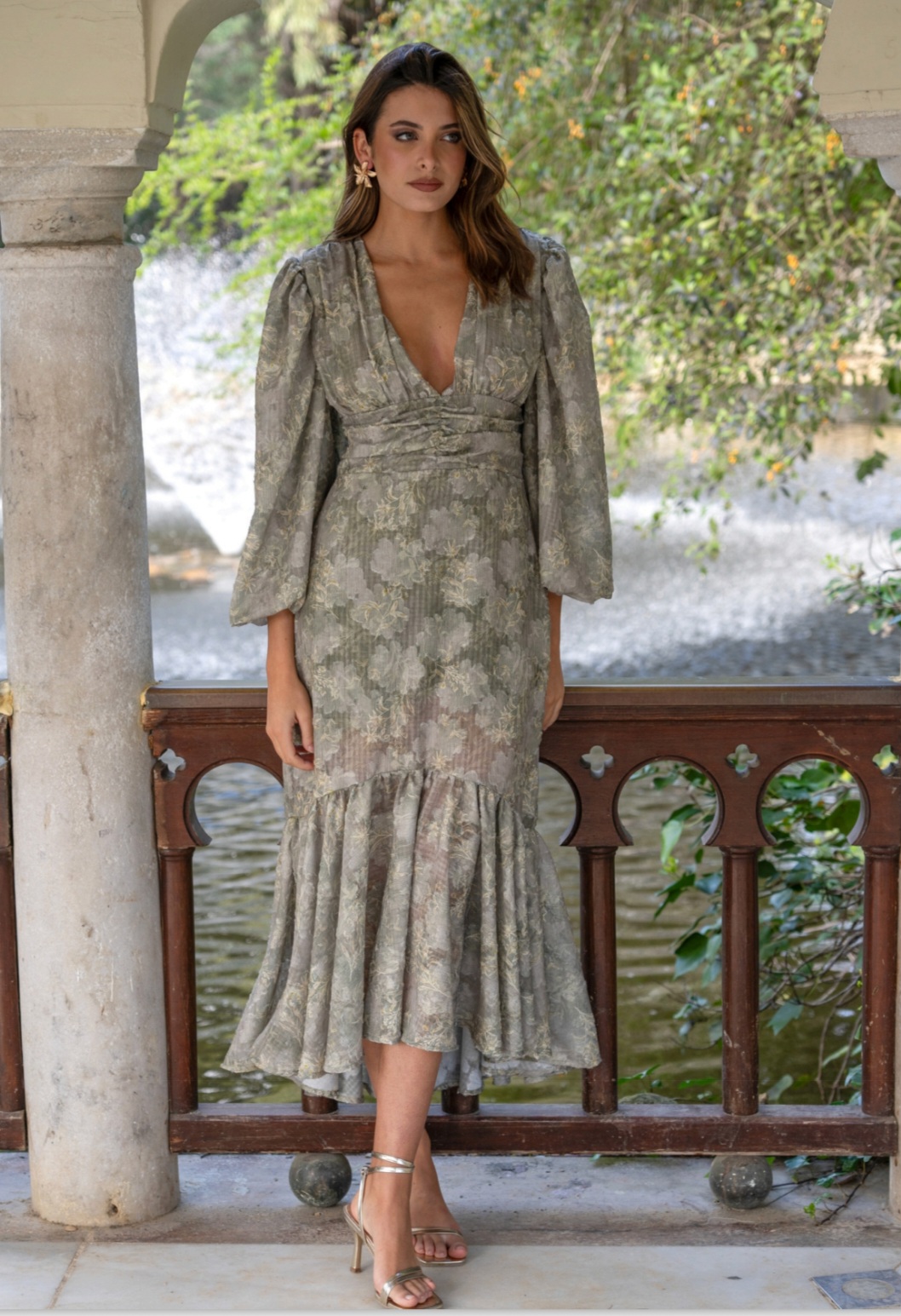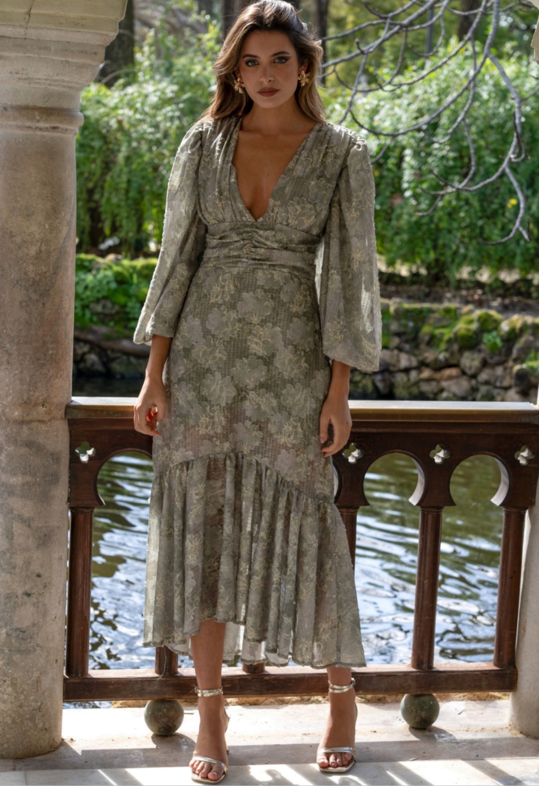 Déjate seducir por la delicadeza del Vestido Midi Bianca, una prenda que encapsula la esencia de un jardín en calma. Su tejido fluido en un suave tono verde salvia presenta un sutil relieve y un estampado floral etéreo en beige, creando una textura visual rica y sofisticada.