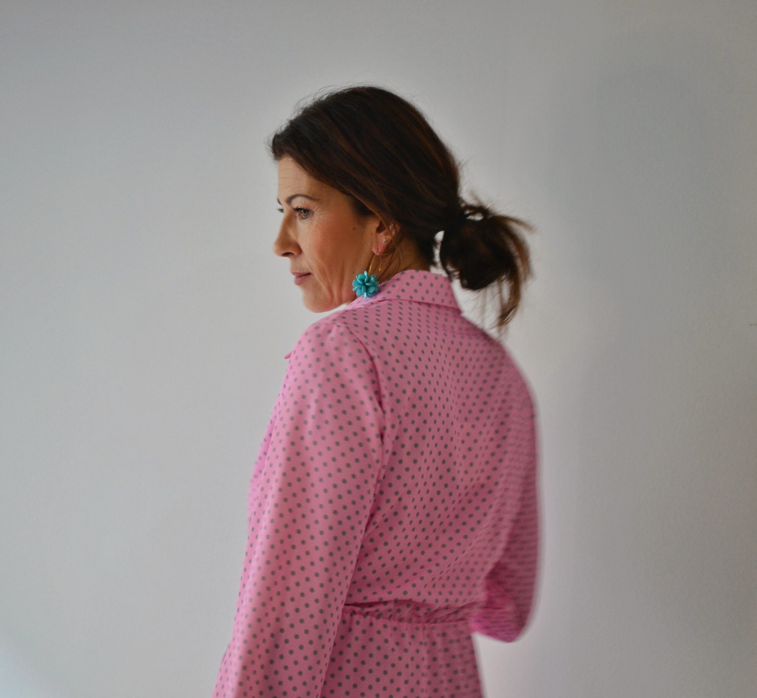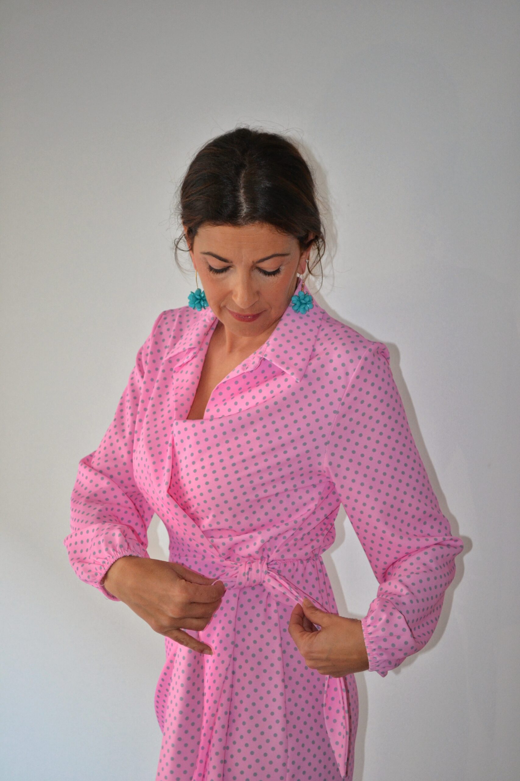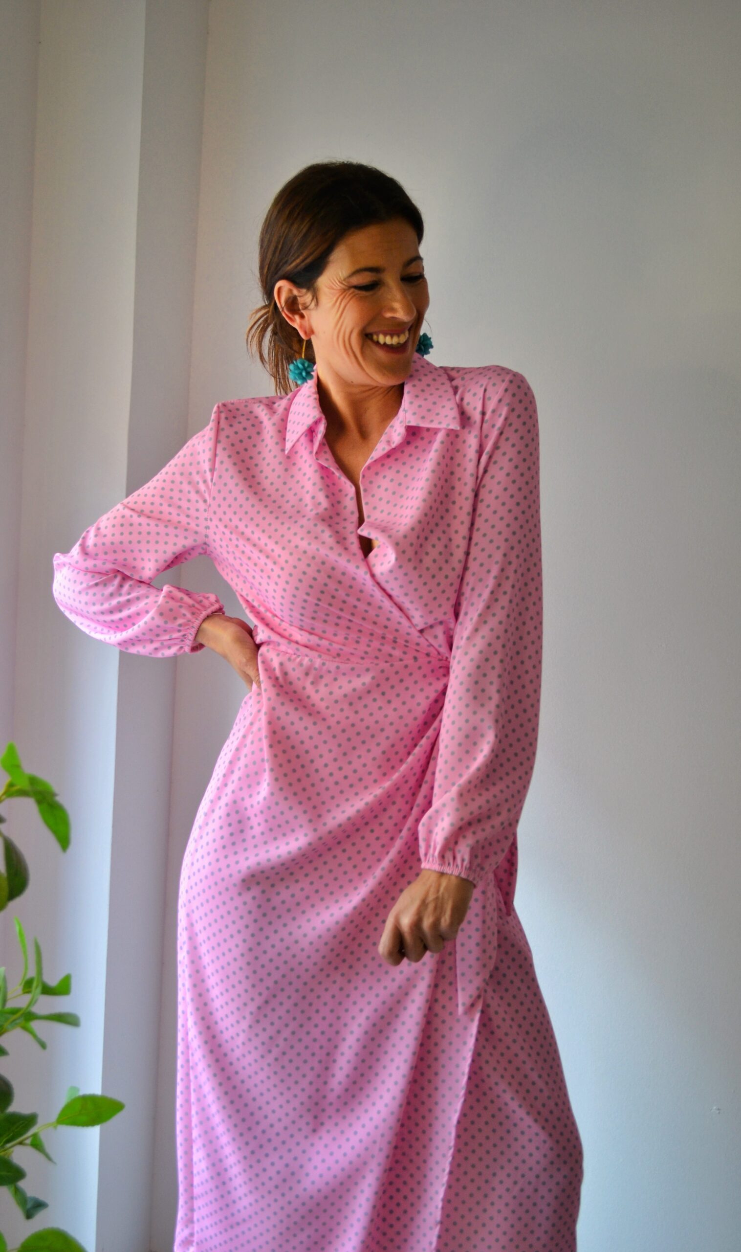 Eleva tu armario con este sofisticado vestido camisero de corte cruzado, una prenda que combina la elegancia clásica con un toque divertido y moderno. Su vibrante color rosa chicle con estampado de lunares en gris suave lo convierte en la opción ideal tanto para eventos de día como para un look de oficina con mucha personalidad.