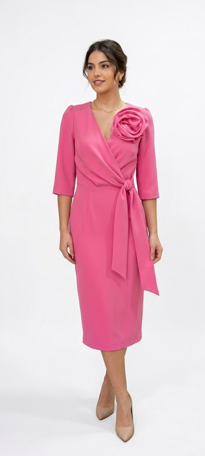 Este vestido es ideal para cualquier evento de día o de noche donde quieras destacar con elegancia y un toque romántico. Su color rosa vibrante y los detalles artesanales lo convierten en una pieza de «invitada perfecta».