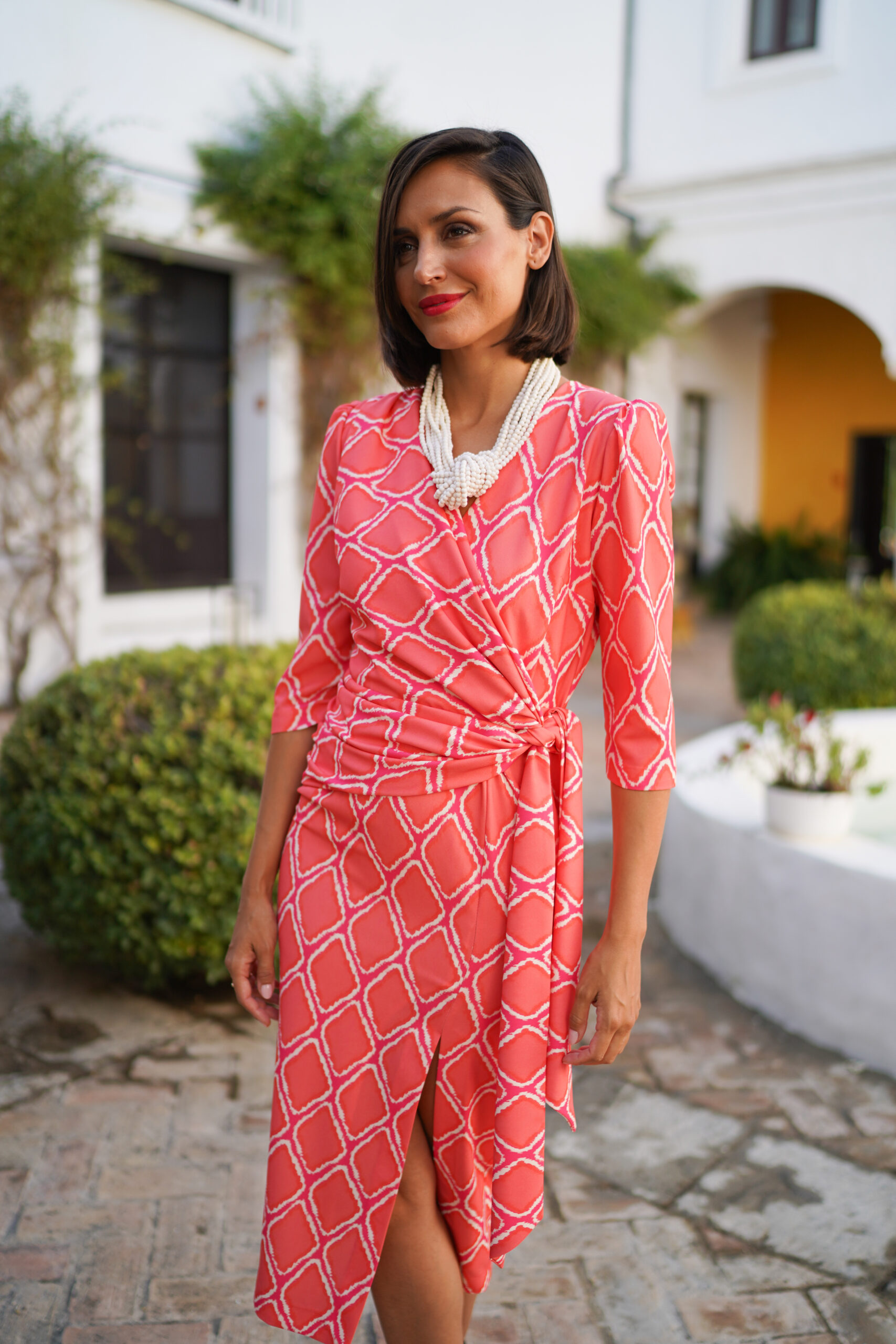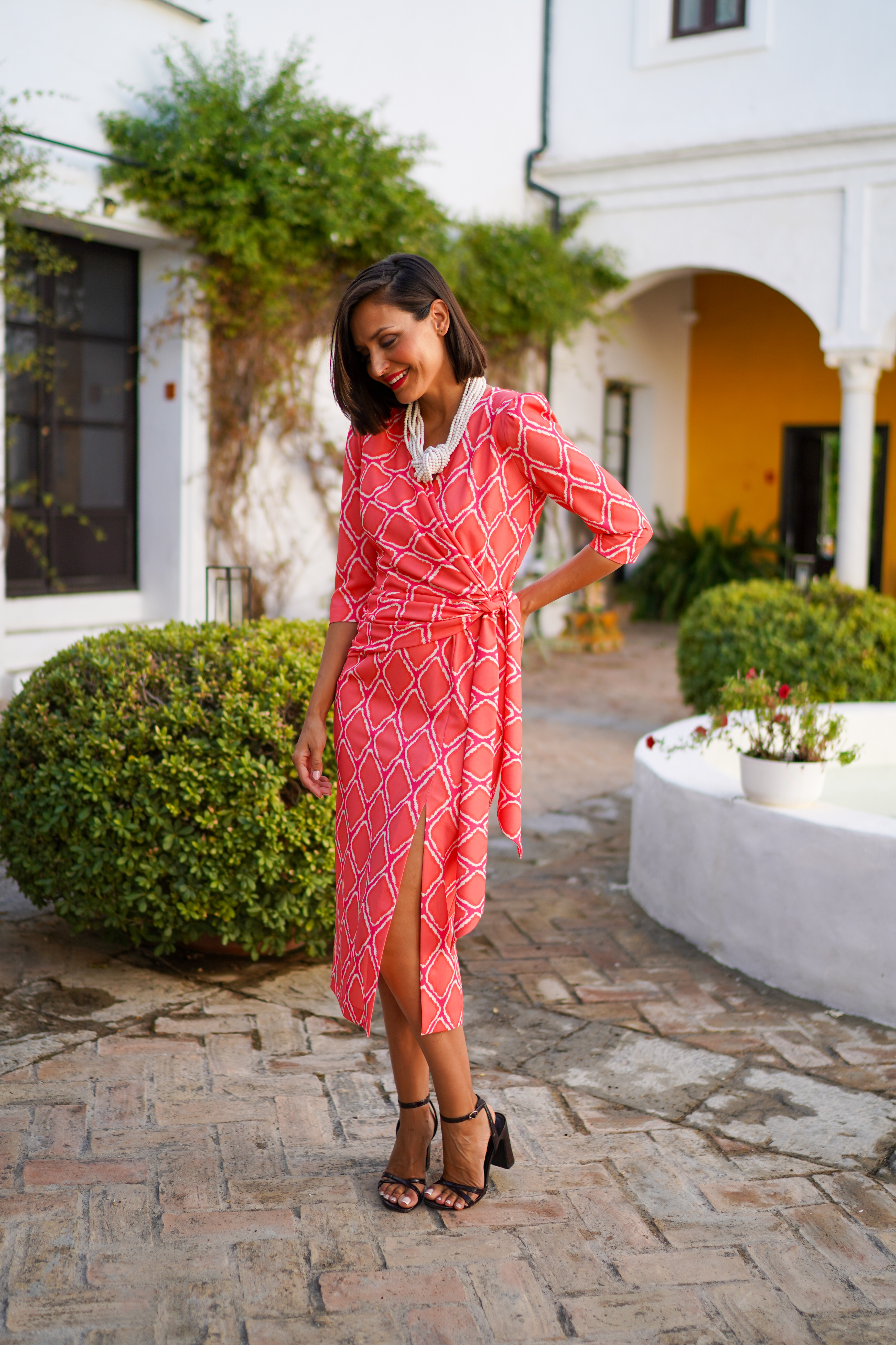 Eleva tu estilo de invitada con nuestro vestido midi en tono coral vibrante, una pieza diseñada para realzar la figura con una caída impecable y un estampado que no pasa desapercibido.