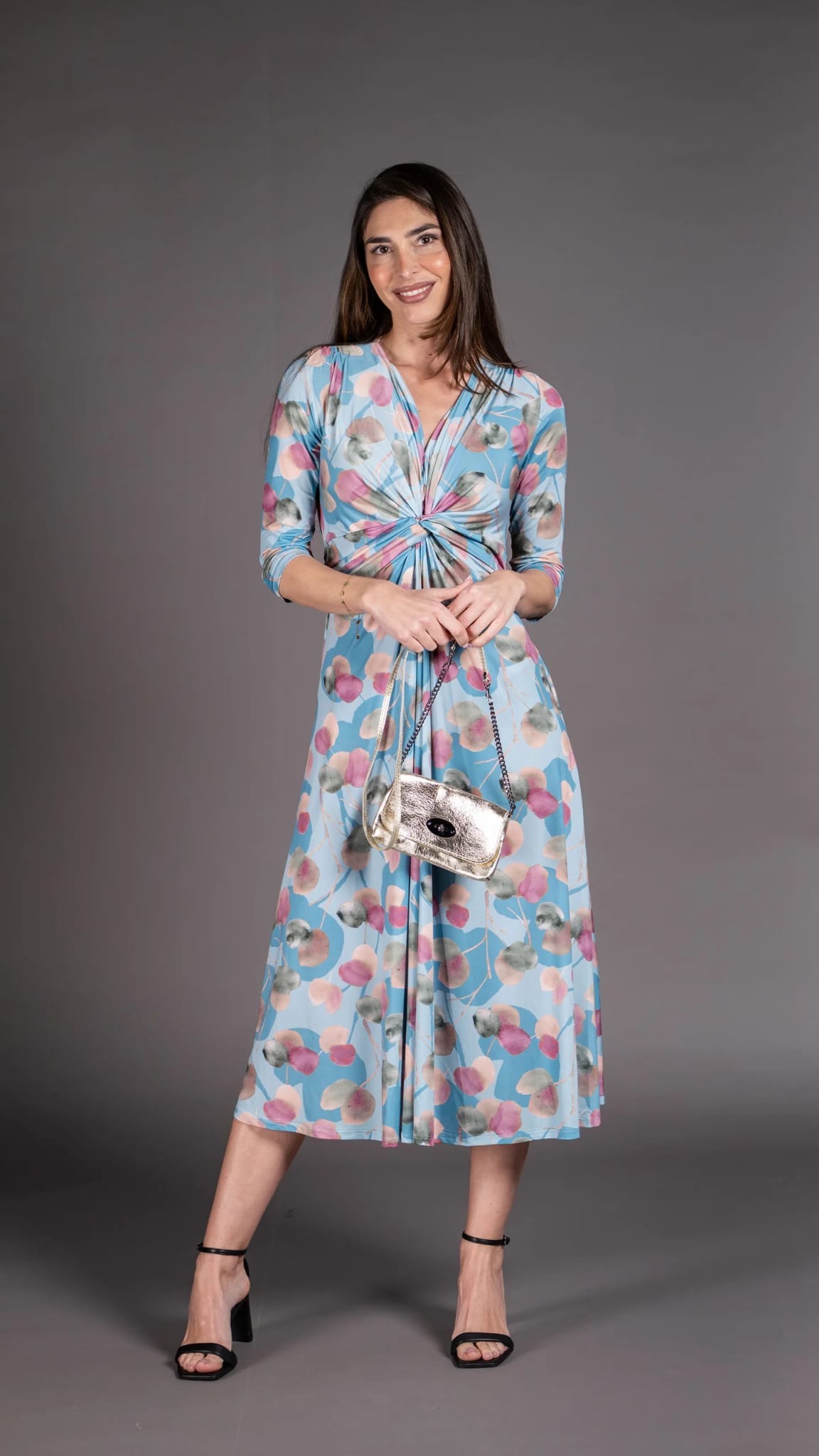 Eleva tu estilo con el Vestido Jacinta, una prenda de largo midi diseñada para destacar en eventos de día, bautizos o cenas especiales. Su tejido fluido y su estampado botánico en tonos pasteles crean un look fresco, femenino y sofisticado.