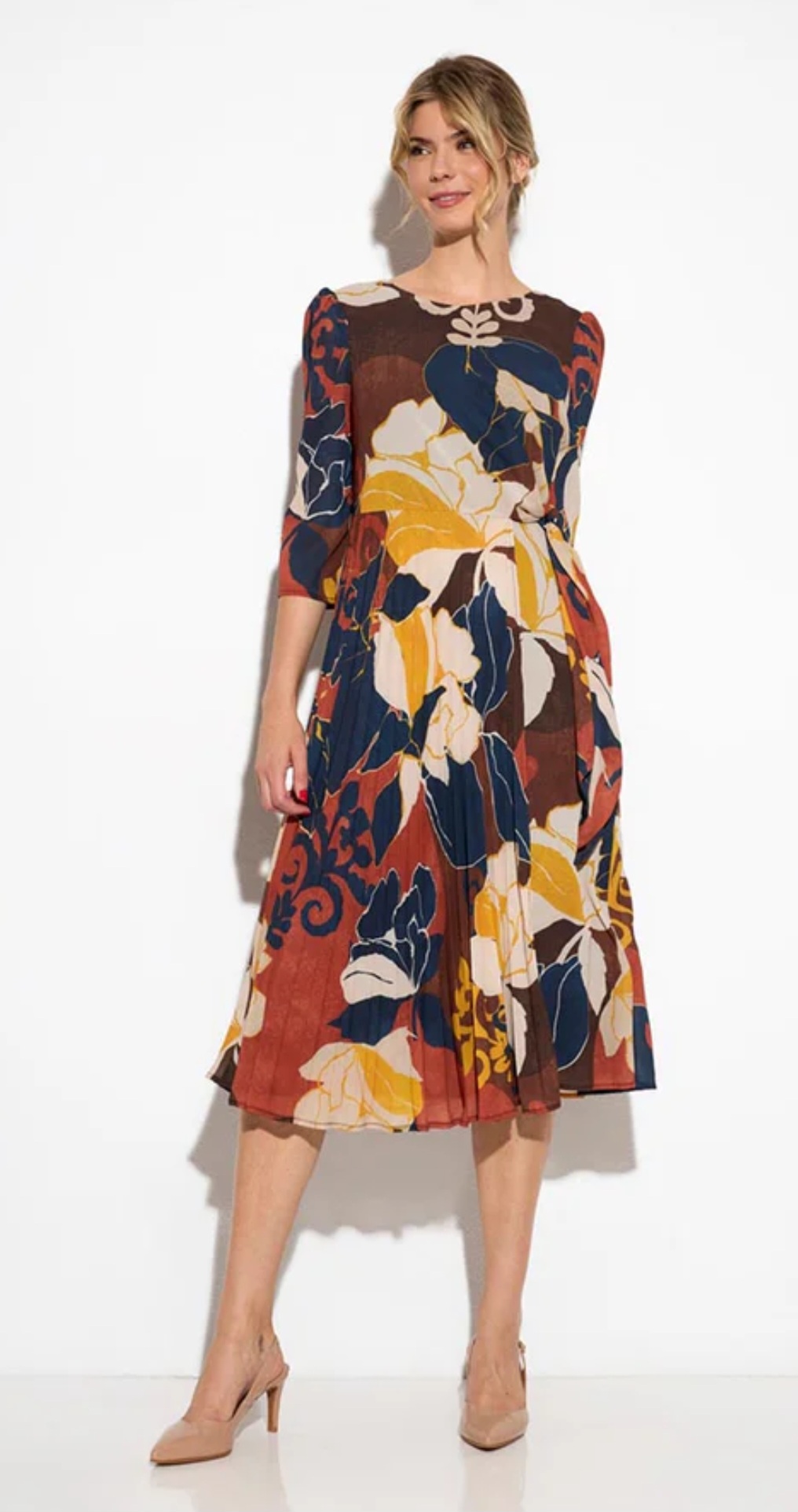 Estampado Floral: Presenta un diseño botánico abstracto en una rica combinación de tonos caldera, mostaza, azul marino y crema sobre un fondo marrón chocolate.