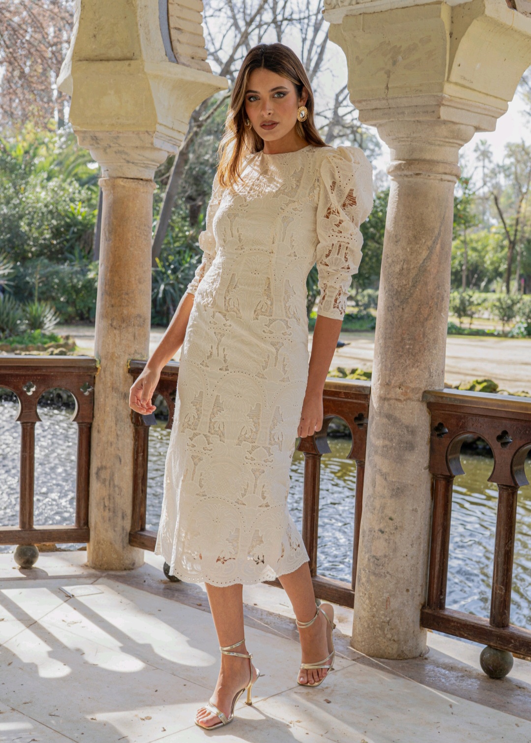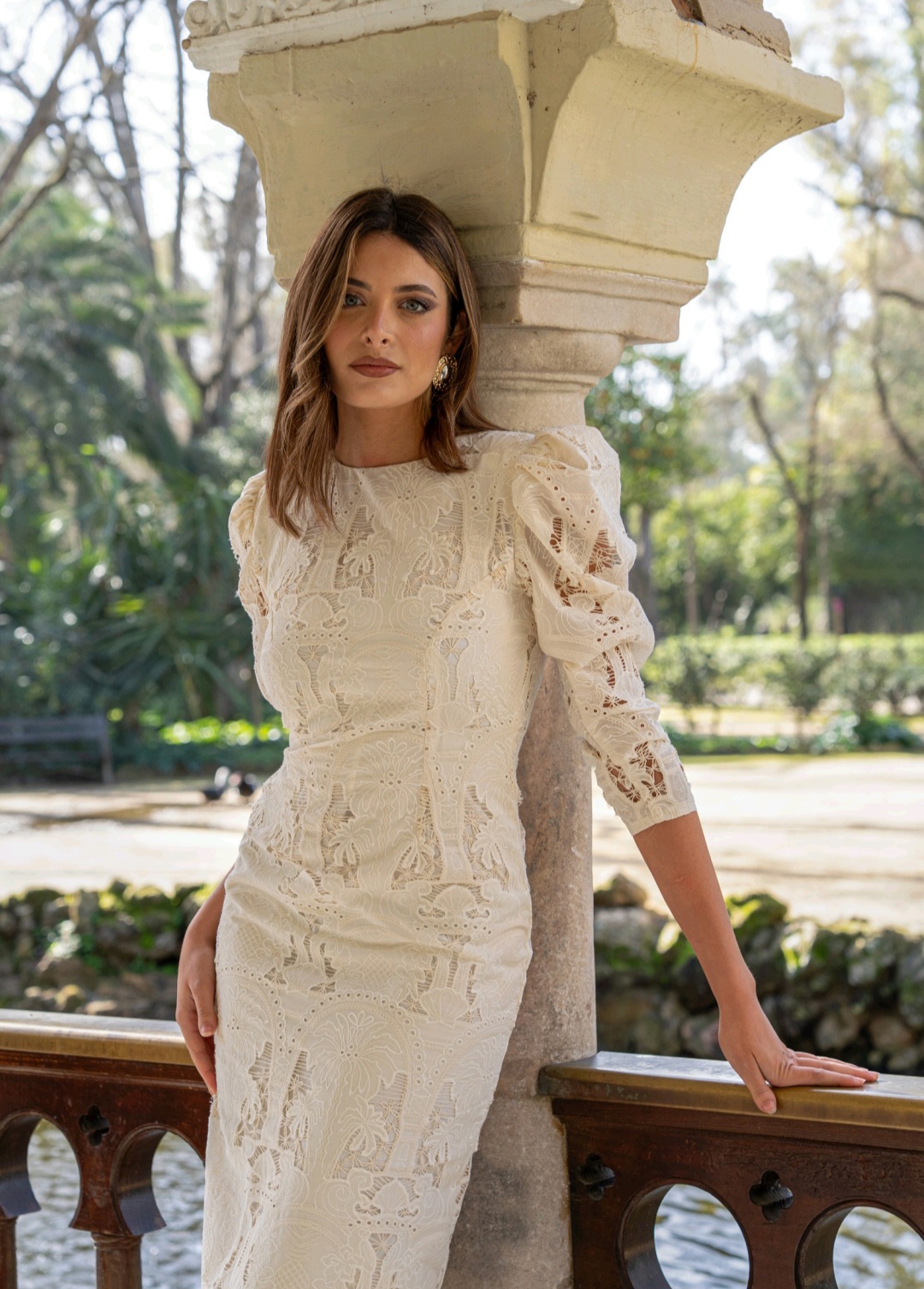 Eleva tu propuesta de estilo para eventos especiales con el vestido midi Savia. Esta pieza es una verdadera obra de arte textil, meticulosamente confeccionada en un exquisito encaje de guipur en tono marfil suave. El diseño logra un equilibrio perfecto entre la sofisticación clásica y las tendencias contemporáneas.