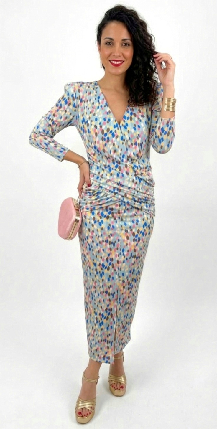 Para un look de «Invitada Perfecta», combínalo con sandalias doradas (como se ve en la imagen) para resaltar los tonos cálidos del estampado. Añade un clutch en tono rosa palo para mantener la armonía cromática y unos pendientes XL que enmarquen tu sonrisa.