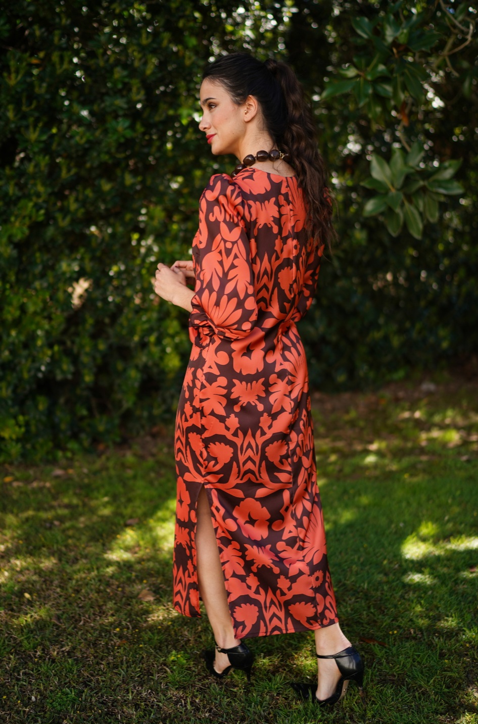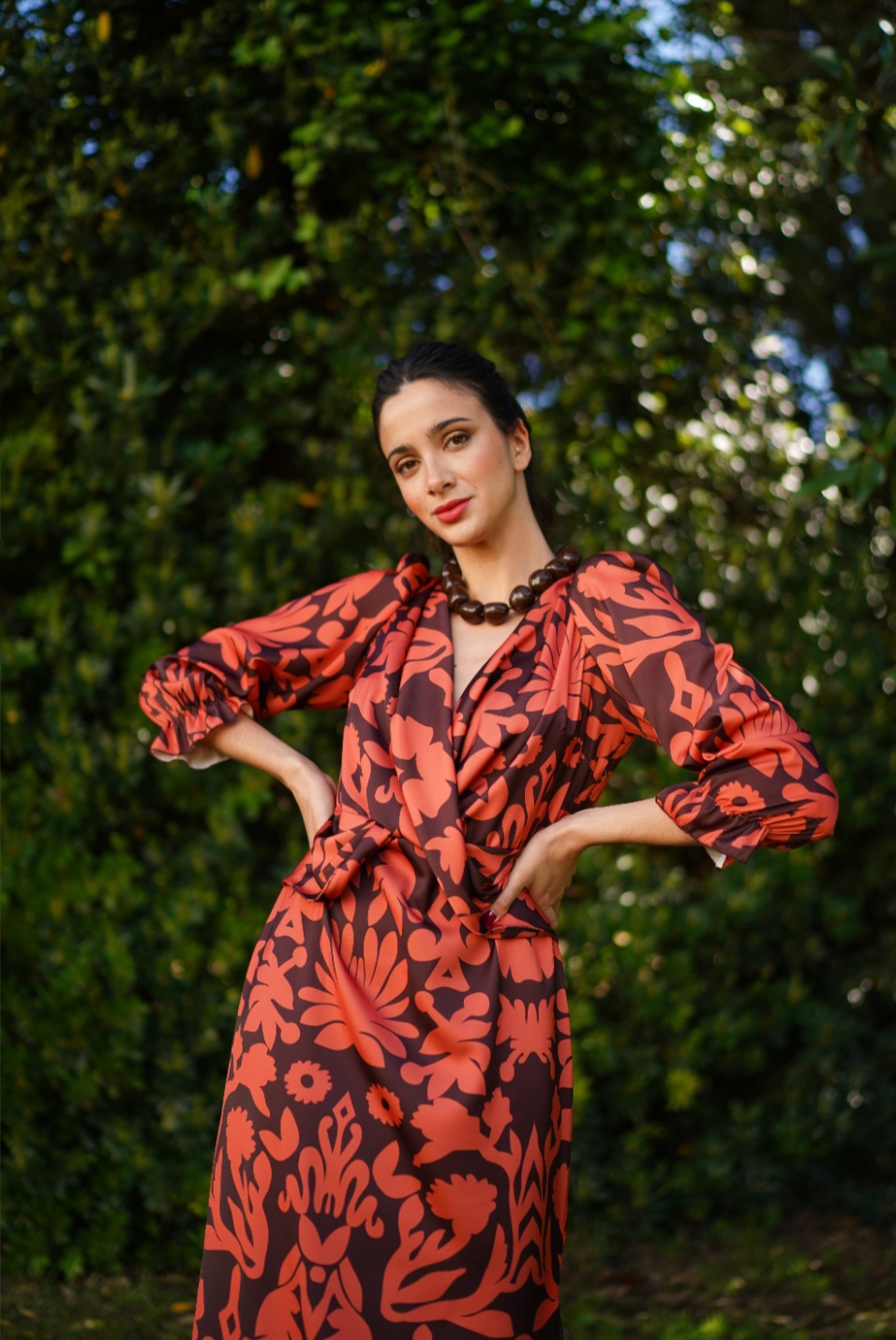 Eleva tu armario de ocasiones especiales con nuestro vestido midi en una cautivadora combinación de tonos tierra y terracota. Este diseño fusiona un aire retro-chic con detalles contemporáneos, creando una silueta femenina y estructurada que no pasa desapercibida.